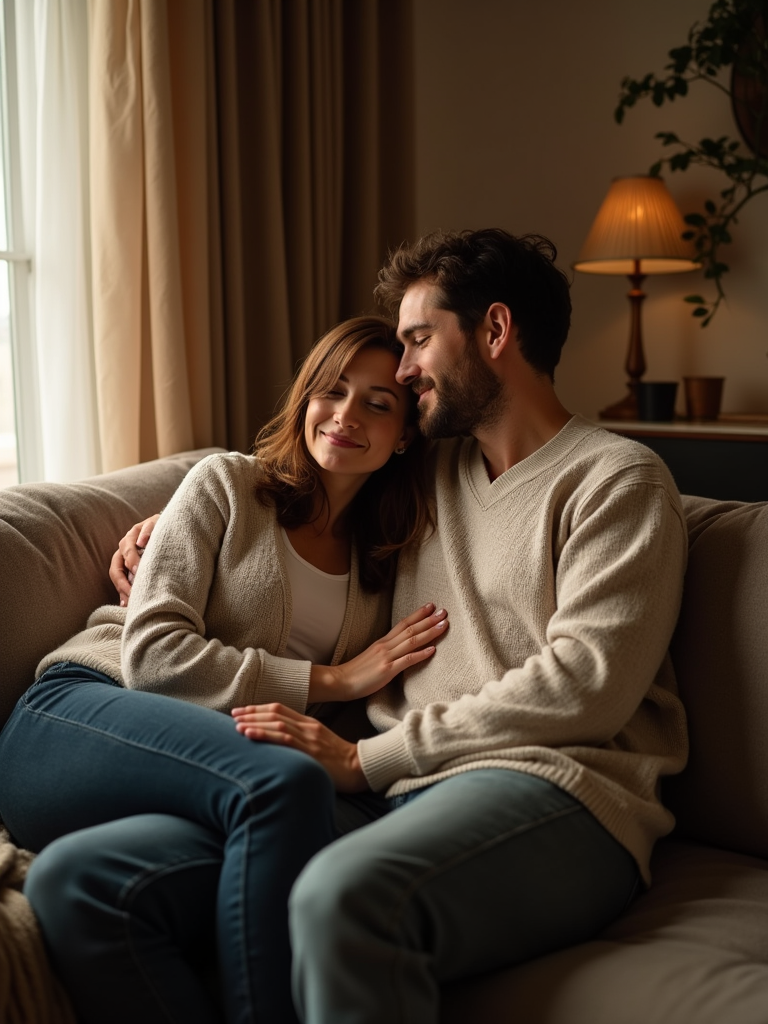 Cozy and intimate engagement photoshoot at home. Wearing a relaxed casual outfit . Cuddling on the couch, warm and intimate lighting.