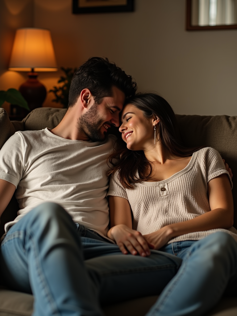 Cozy and intimate engagement photoshoot at home. Wearing a relaxed casual outfit . Cuddling on the couch, warm and intimate lighting.