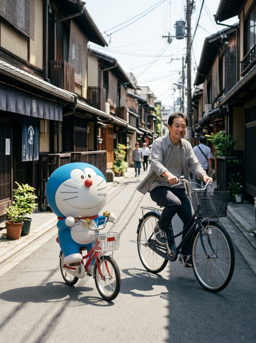 Create a hyper-realistic cinematic photo inspired by the reference scene exactly. Keep the same Japanese-style street with traditional houses, a clean road, bright sunny daylight, soft natural shadows, and subtle motion blur. Place the subject riding a bicycle in the exact same camera angle, body posture, and lighting as the reference, capturing smooth forward movement and a lively street atmosphere. Beside him, add a 3D-style cartoon character similar to Doraemon, also riding a bicycle, scaled realistically with accurate perspective, shadows, and ground contact. Both riders should share a playful, energetic mood, as if enjoying a carefree ride together. Colors should remain natural and vibrant, with crisp textures, realistic depth of field, and an ultra-HD photography look that blends cinematic realism with lighthearted charm.