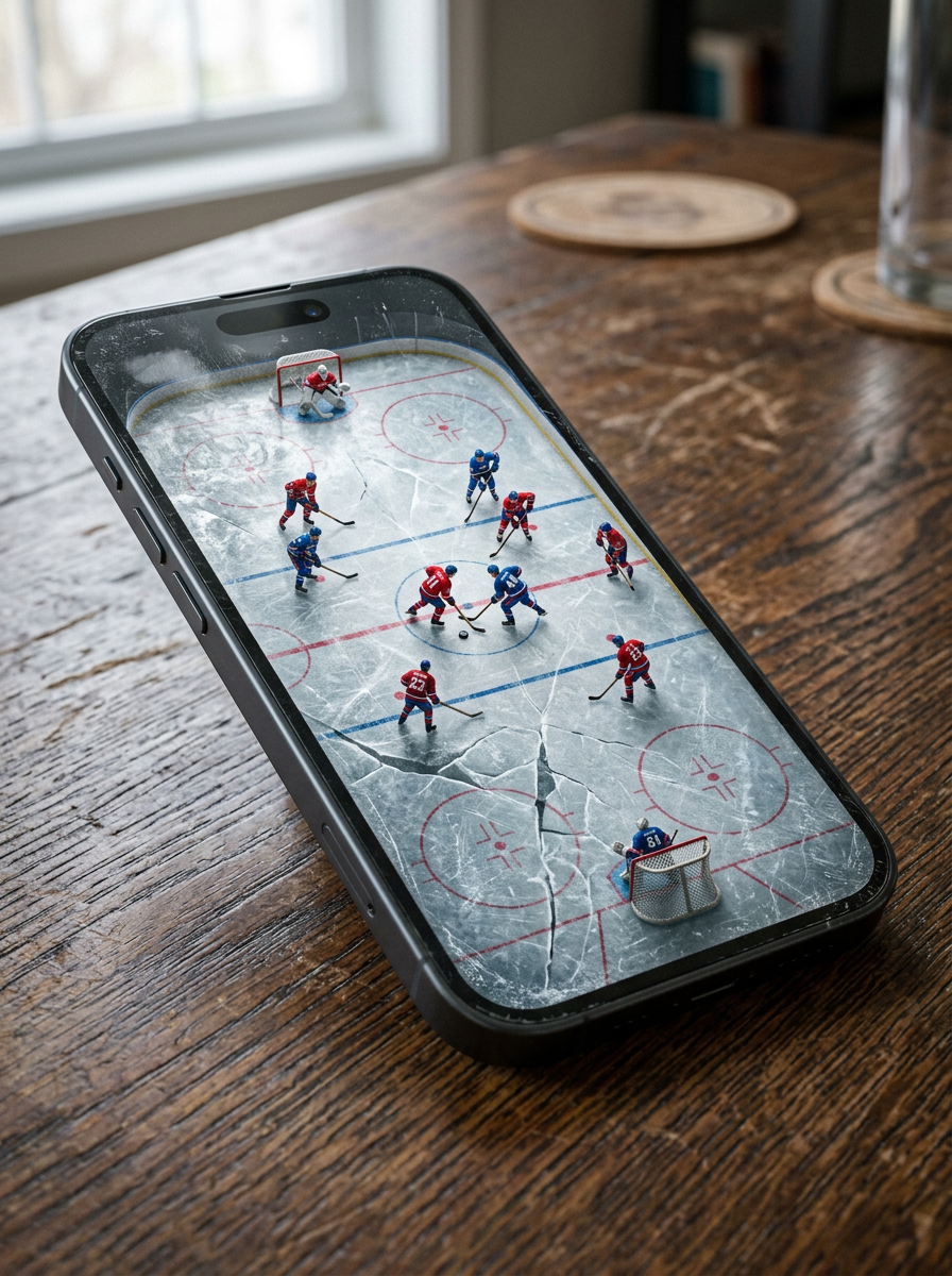 Create a hyper-realistic, stylish vertical poster featuring a smartphone lying on a table, transformed into a hockey rink. The screen resembles cracked ice with deep fissures, while tiny hockey players compete in an intense game Use diffused daylight with elegant reflections and refractions to enhance depth. Add realistic details like fingerprints, smudges, and subtle scratches on the phone's surface for authenticity. Craft a dynamic perspective with an intriguing camera angle-slightly tilted for dramatic effect. The image should look like a high-quality DSLR photograph, with sharp focus, rich textures, and cinematic lighting to amplify the surreal yet lifelike atmosphere