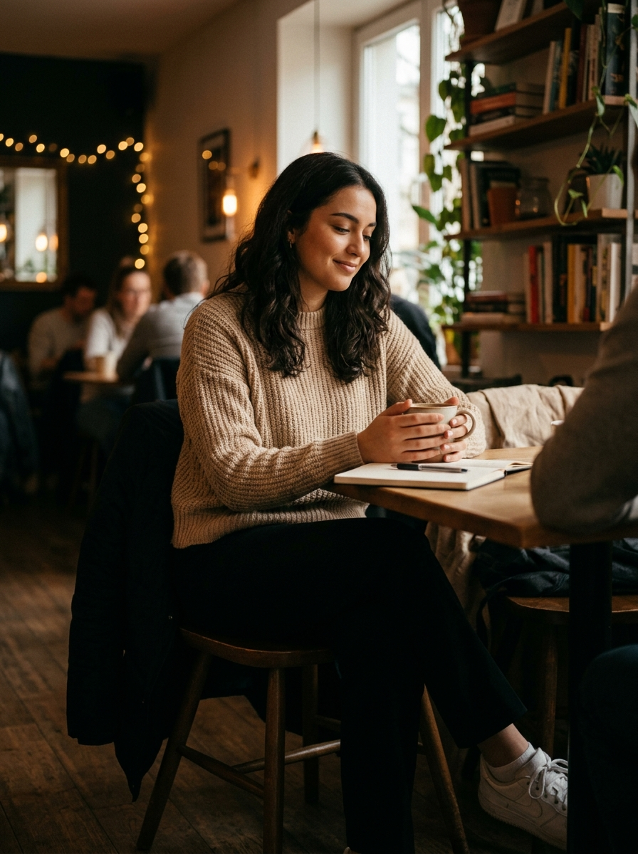 Create a natural, ultra-realistic cinematic café portrait that captures a quiet, introspective candid moment with warm, comforting atmosphere. Young adult model in Cozy indoor café wearing Simple, elegant clothing in neutral tones. Style: Cinematic, natural realism