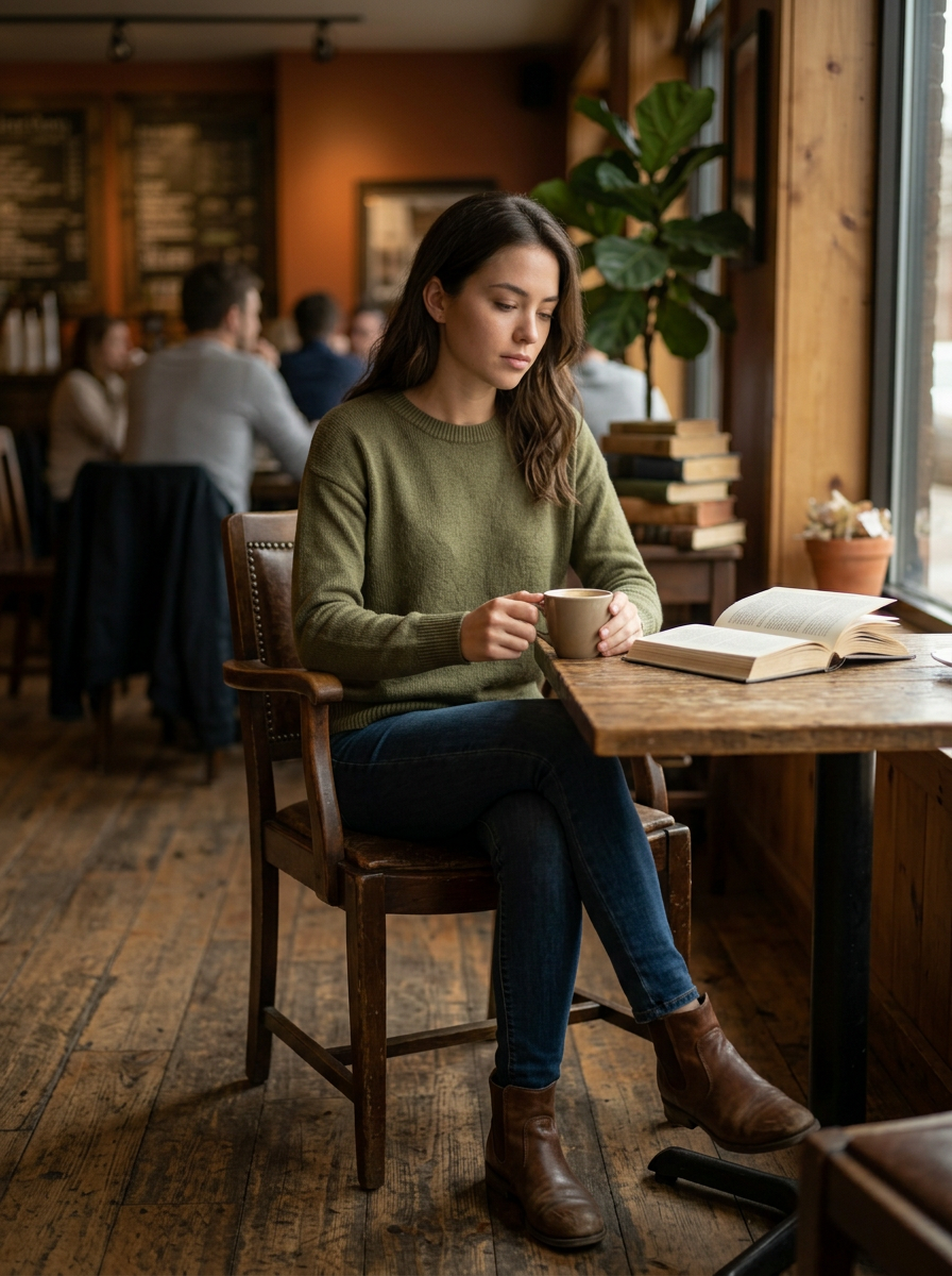 Create a natural, ultra-realistic cinematic café portrait that captures a quiet, introspective candid moment with warm, comforting atmosphere. Young adult model in Cozy indoor café wearing Simple, elegant clothing in neutral tones. Style: Cinematic, natural realism