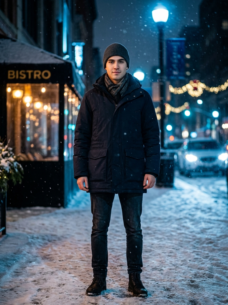Create an ultra-realistic cinematic close-up winter portrait with a moody urban atmosphere, balancing cool winter tones and warm city light. Young adult model in Outdoor winter city street at night