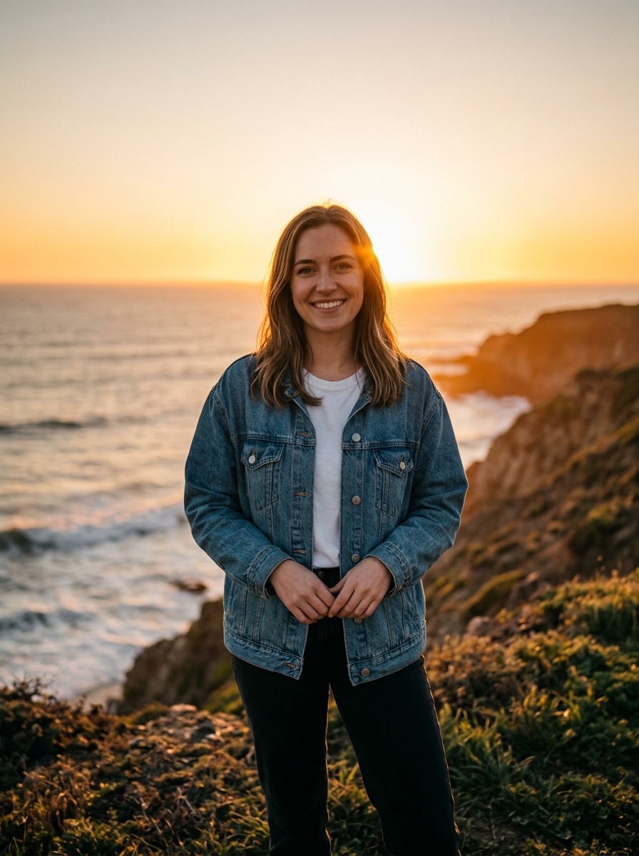Create an ultra-realistic cinematic portrait at sunset that captures emotional subtlety, natural beauty, and a film-quality atmosphere. Young adult model in Outdoor open space near ocean or wide horizon