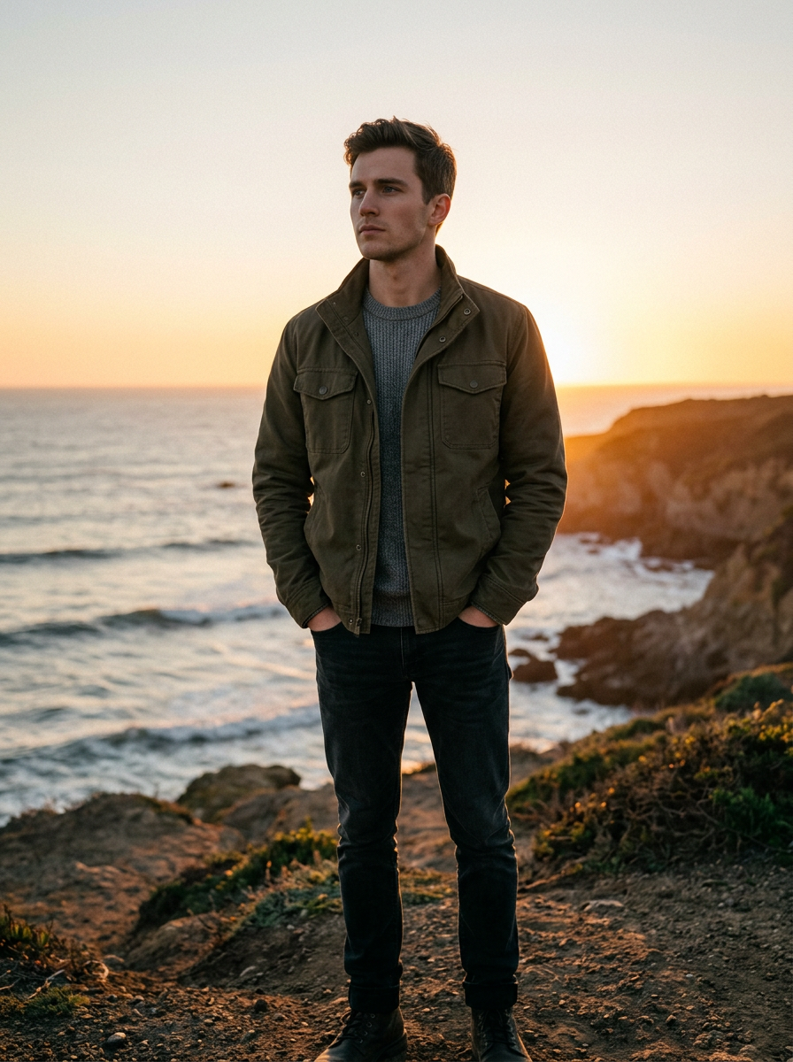 Create an ultra-realistic cinematic portrait at sunset that captures emotional subtlety, natural beauty, and a film-quality atmosphere. Young adult male model in Outdoor open space near ocean or wide horizon