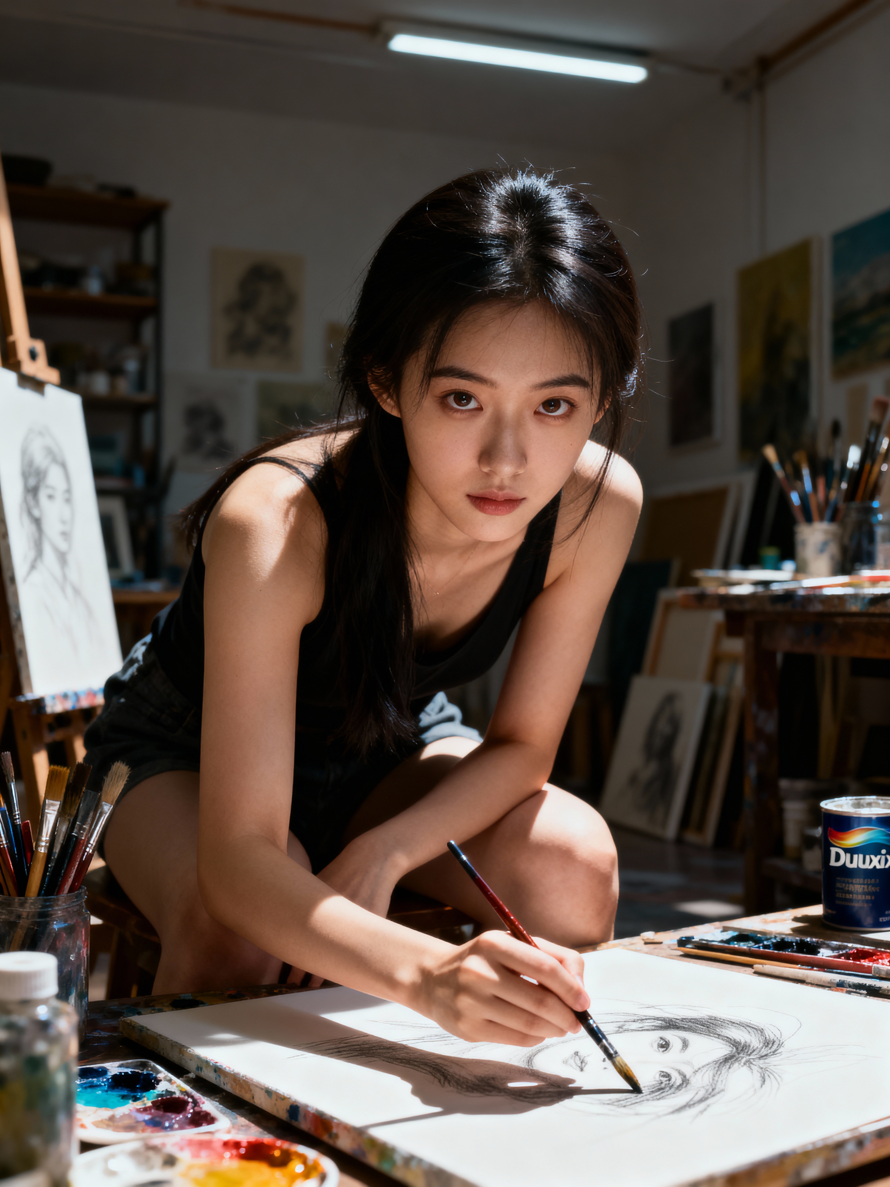 creative feminine model painting or sketching in a personal studio