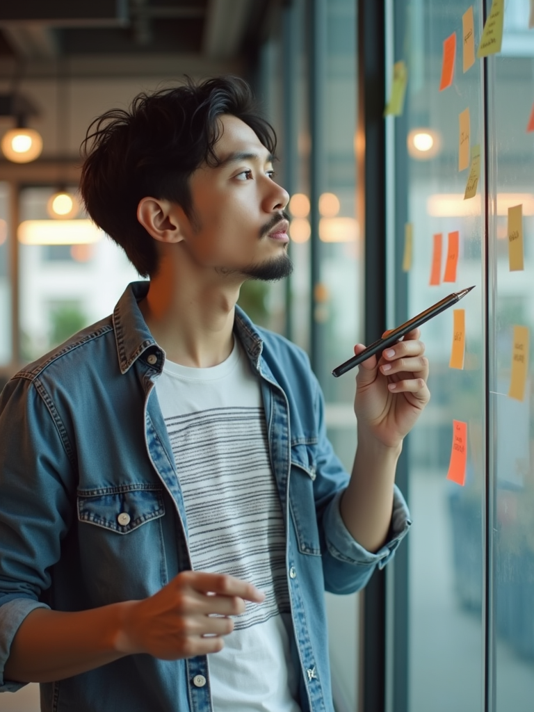 creative model dressed in trendy graphic tee under open shirt brainstorming with sticky notes on glass wall, modern startup space, casual smart outfit