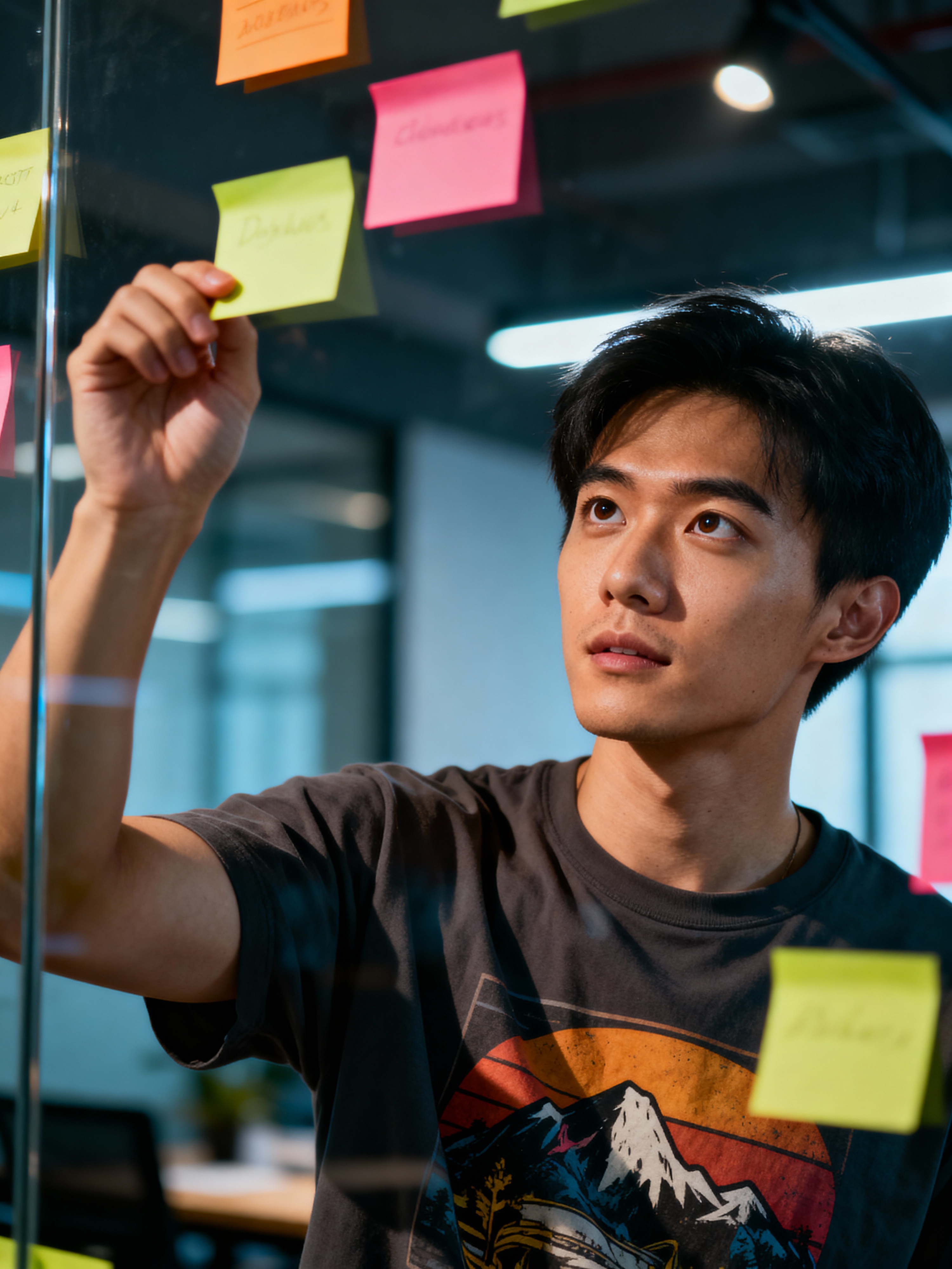 creative model dressed in trendy graphic tee under shirt brainstorming with sticky notes on glass wall, modern startup space, casual smart outfit