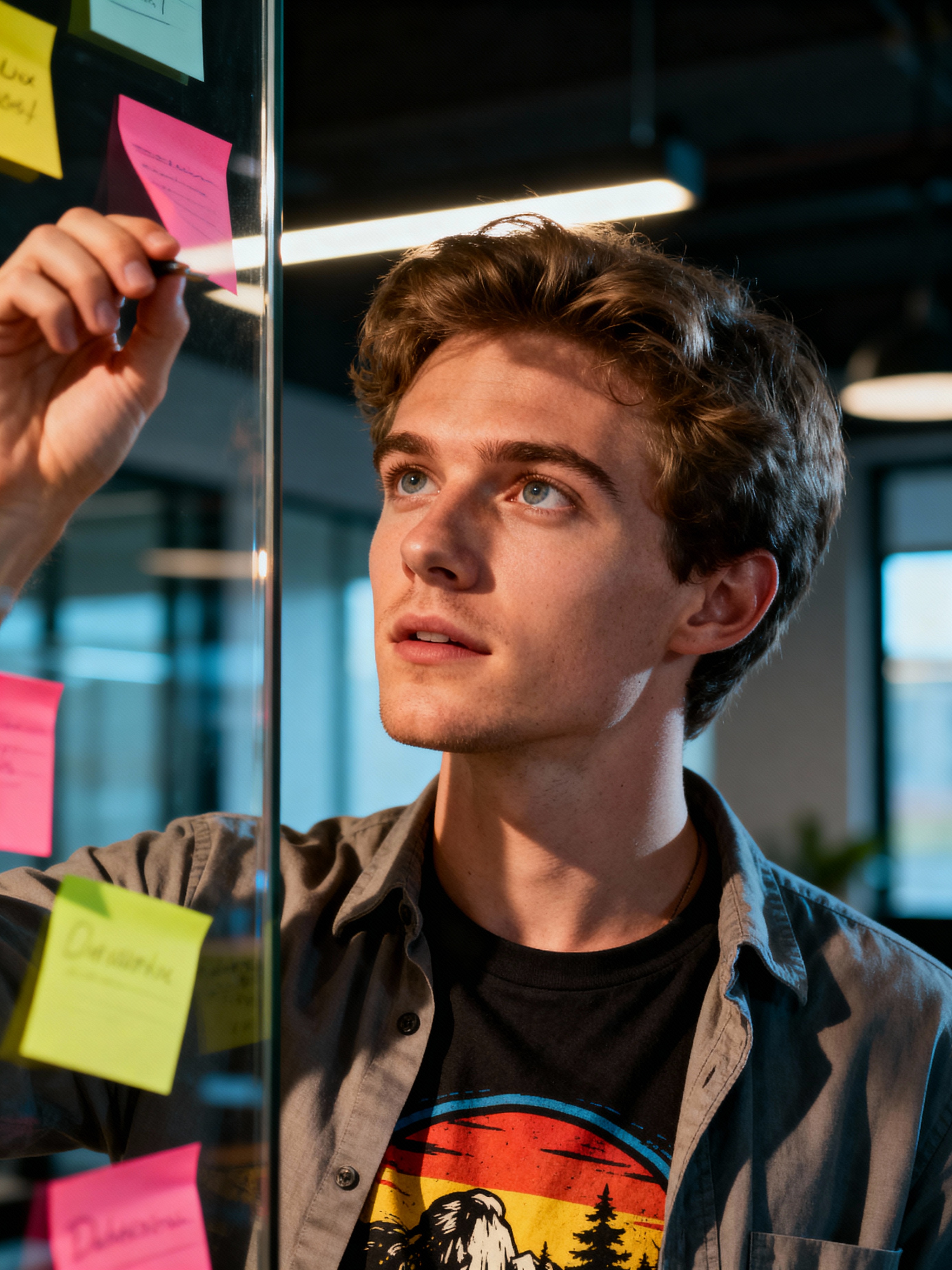 creative model dressed in trendy graphic tee under shirt brainstorming with sticky notes on glass wall, modern startup space, casual smart outfit