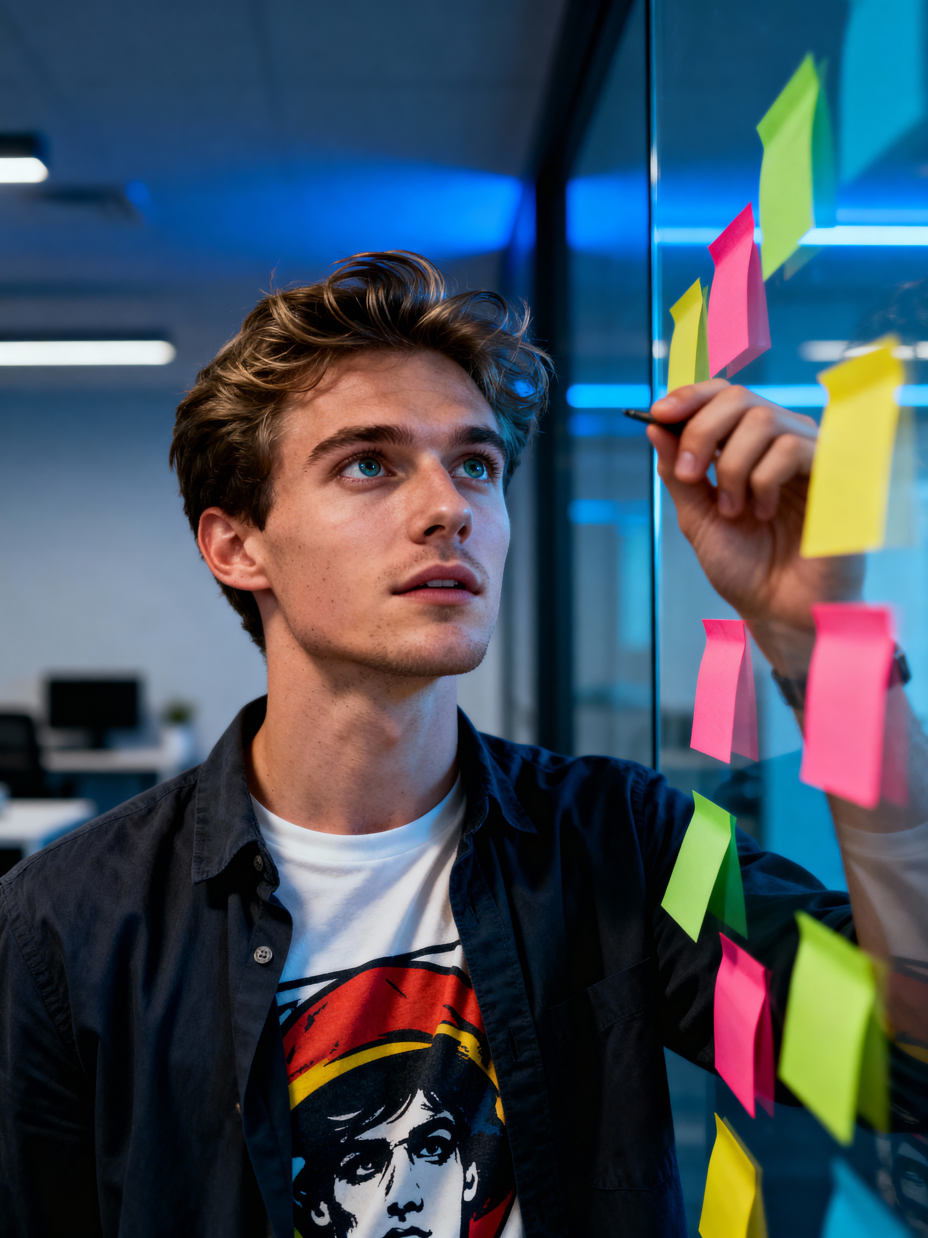 creative model dressed in trendy graphic tee under shirt brainstorming with sticky notes on glass wall, modern startup space, casual smart outfit