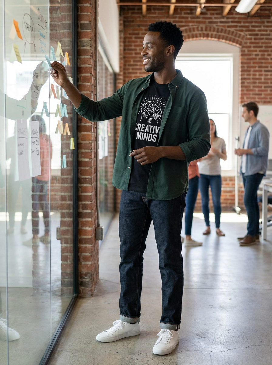 creative model dressed in trendy graphic tee under shirt brainstorming with sticky notes on glass wall, modern startup space, casual smart outfit
