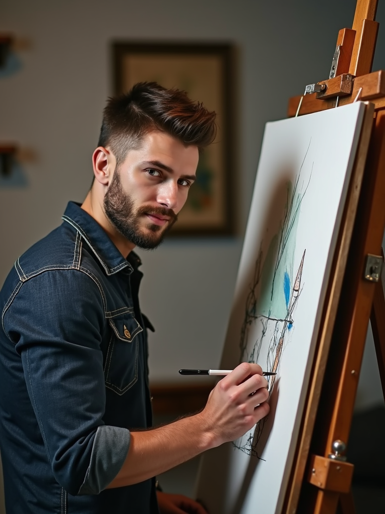 creative masculine model painting or sketching in a personal studio