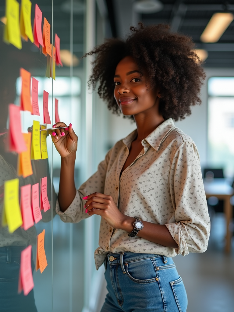 creative model dressed in artistic blouse with designer jeans brainstorming with sticky notes on glass wall, modern startup space, casual smart outfit