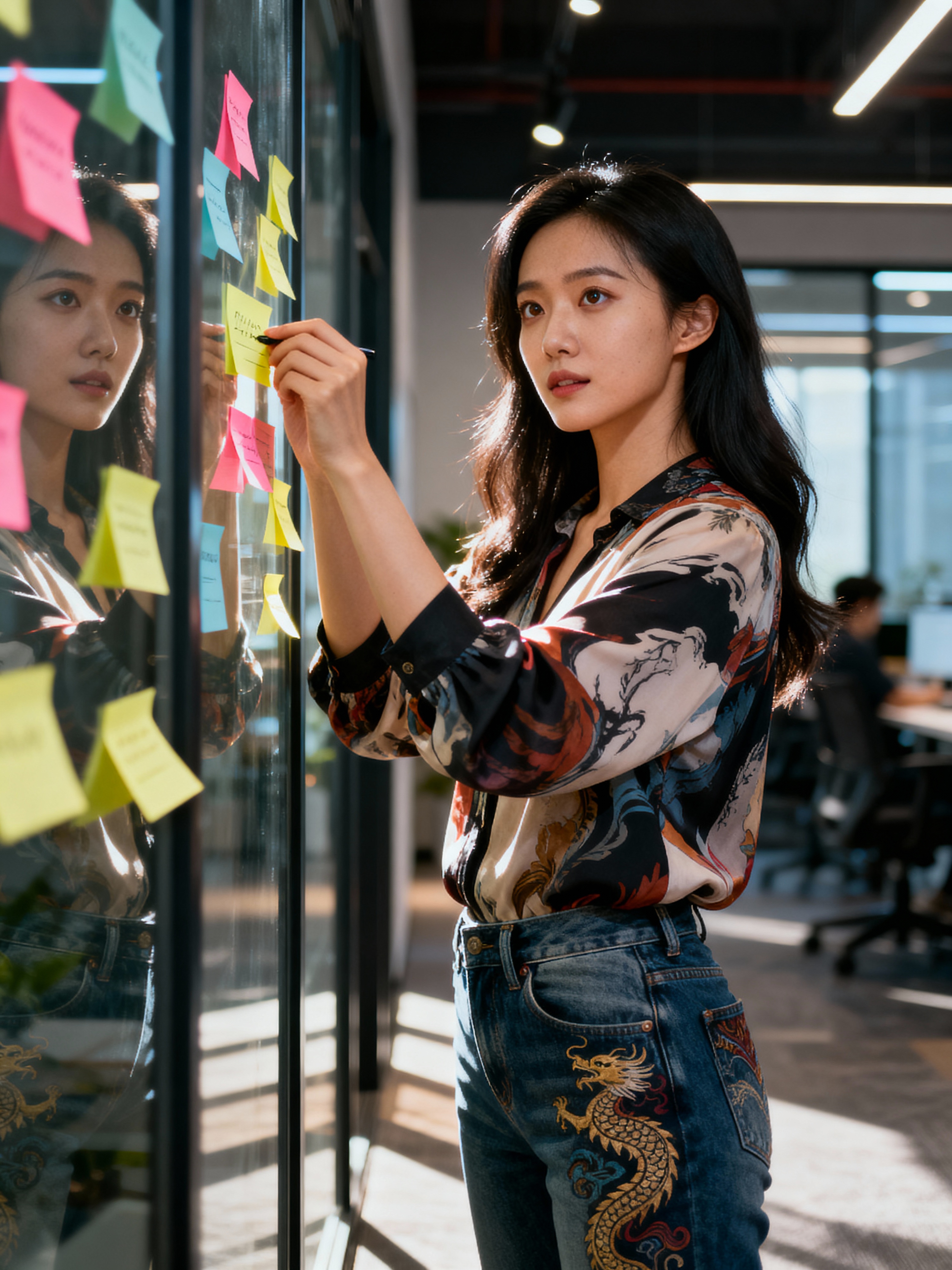 creative model dressed in artistic blouse with designer jeans brainstorming with sticky notes on glass wall, modern startup space, casual smart outfit