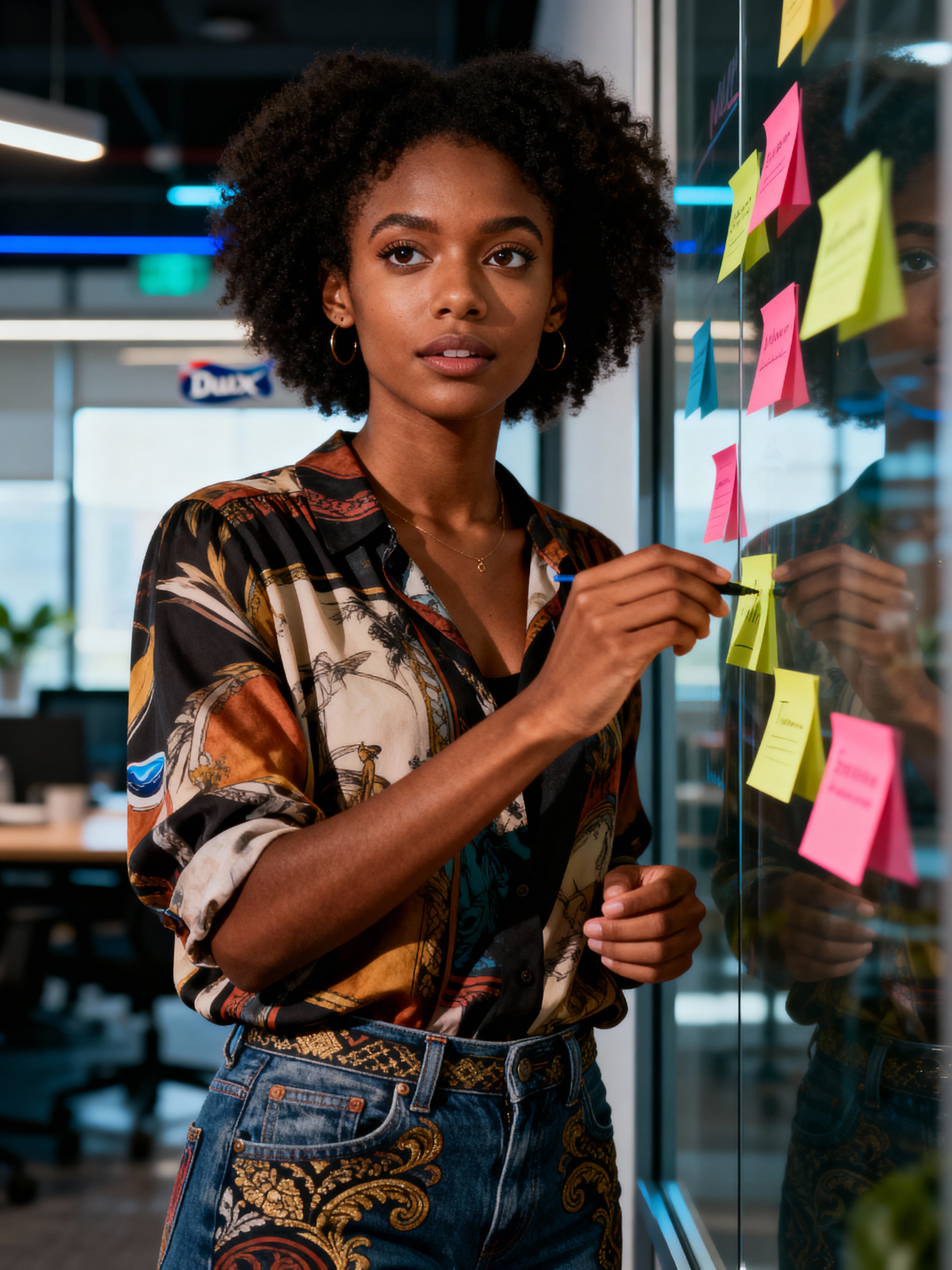creative model dressed in artistic blouse with designer jeans brainstorming with sticky notes on glass wall, modern startup space, casual smart outfit