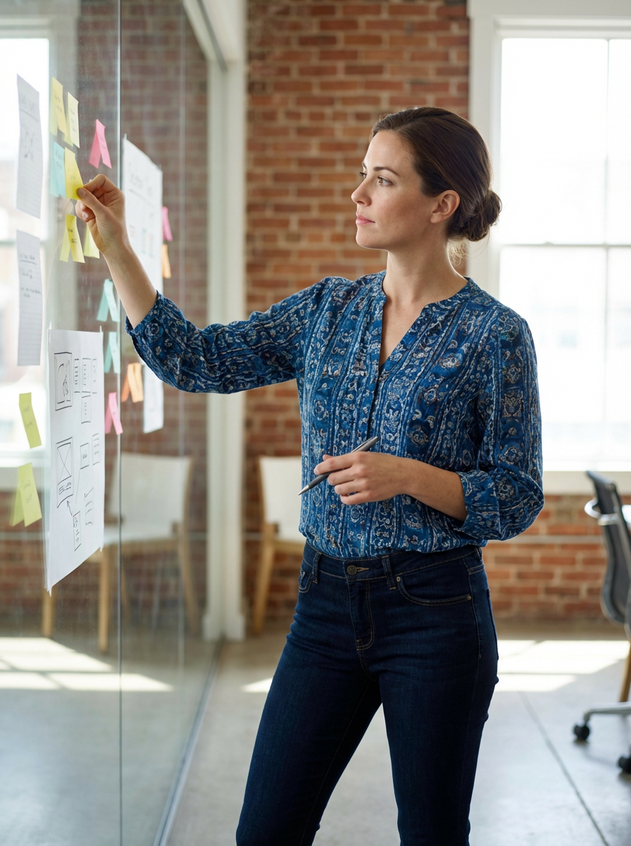 creative model dressed in artistic blouse with designer jeans brainstorming with sticky notes on glass wall, modern startup space, casual smart outfit