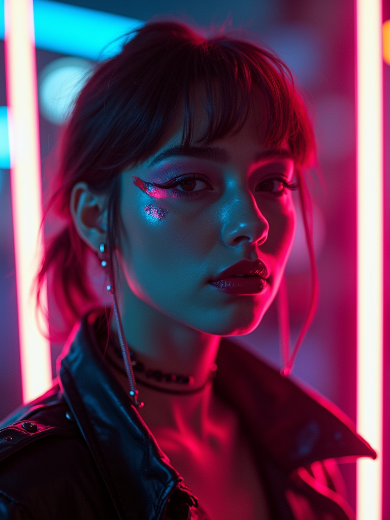 Cyberpunk E-Girl transformation. Dark lipstick, neon eyeliner, futuristic fashion . Tokyo street-style lighting.
