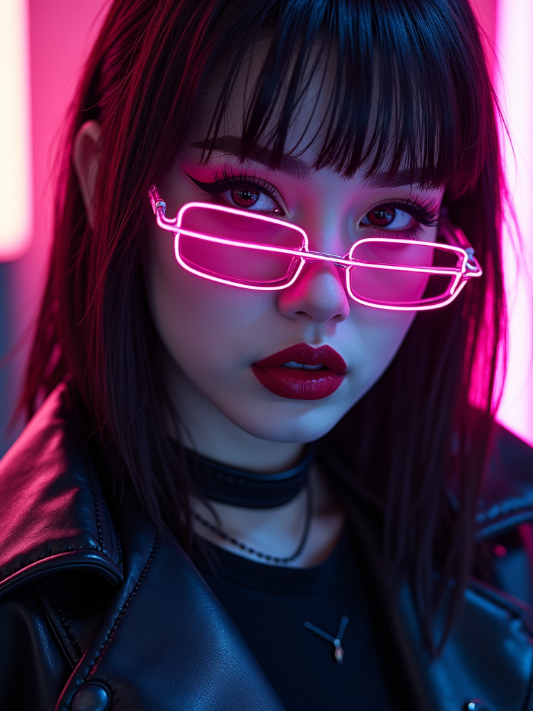 Cyberpunk E-Girl transformation. Dark lipstick, neon eyeliner, futuristic fashion . Tokyo street-style lighting.