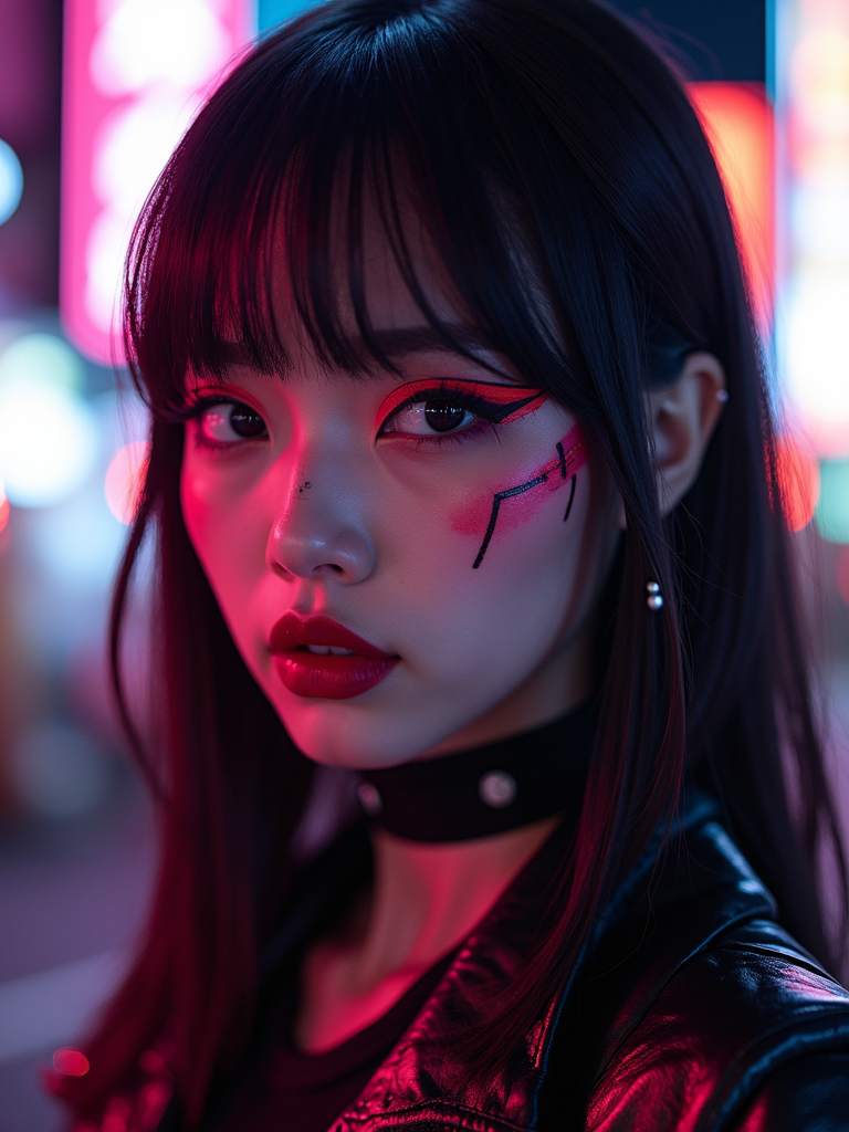 Cyberpunk E-Girl transformation. Dark lipstick, neon eyeliner, futuristic fashion . Tokyo street-style lighting.