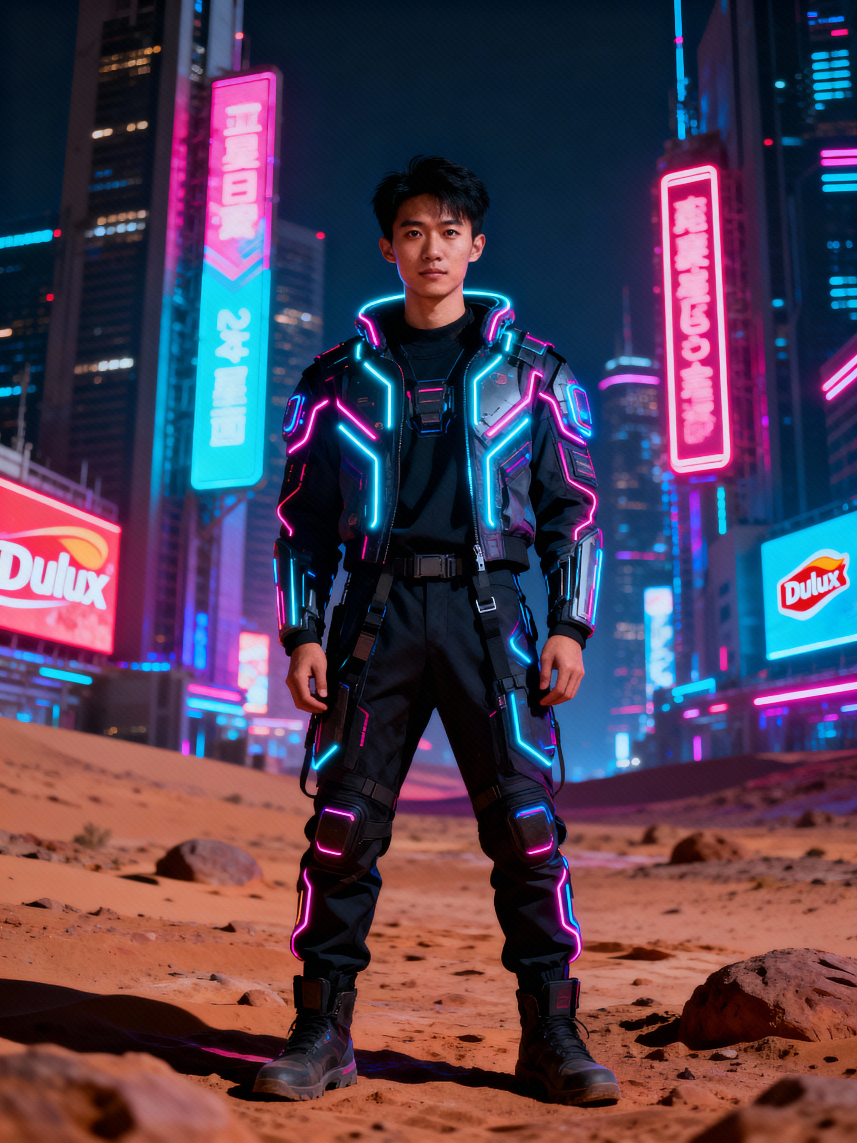 cyberpunk model with futuristic cyberpunk neon clothes standing in cyberpunk city with neon lights city on Mars in future, neon billboards, skyscrapers