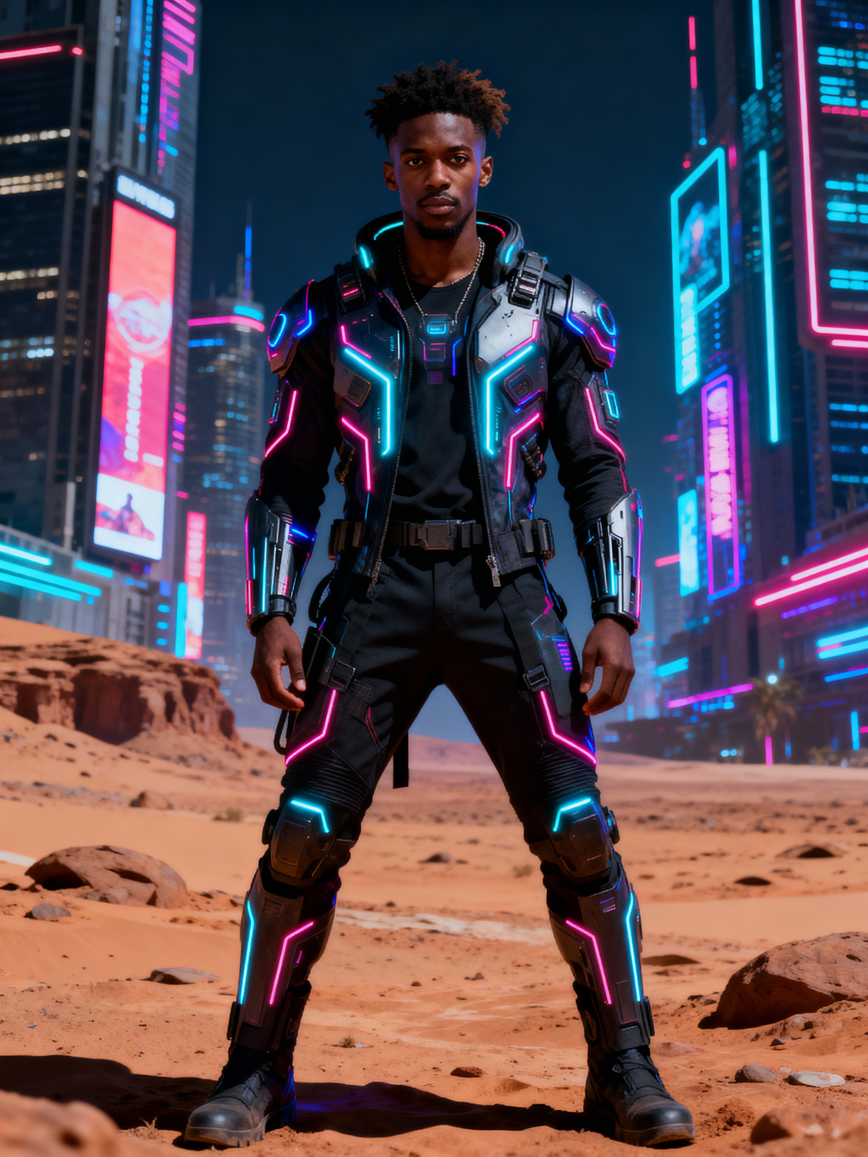 cyberpunk model with futuristic cyberpunk neon clothes standing in cyberpunk city with neon lights city on Mars in future, neon billboards, skyscrapers