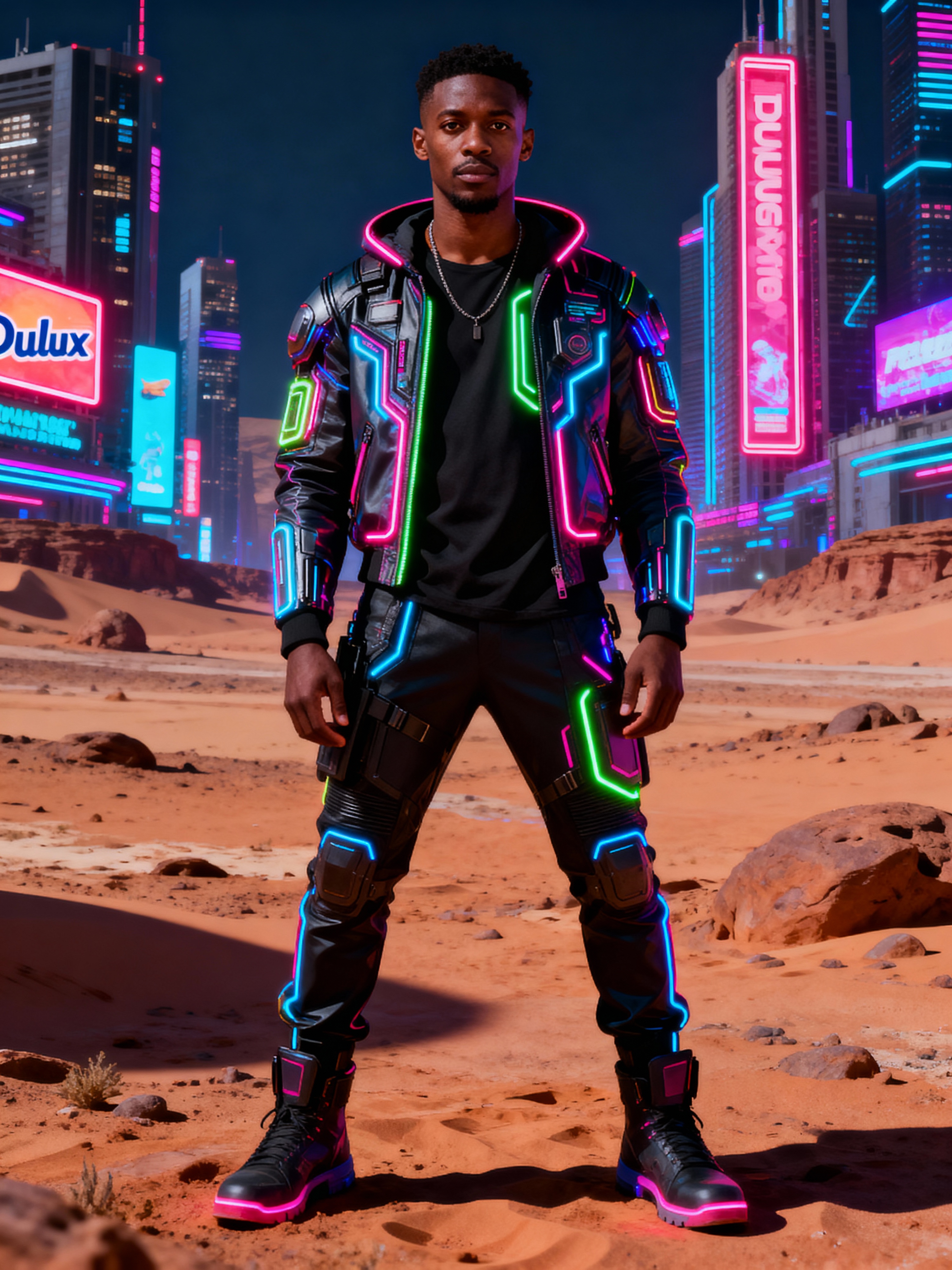 cyberpunk model with futuristic cyberpunk neon clothes standing in cyberpunk city with neon lights city on Mars in future, neon billboards, skyscrapers