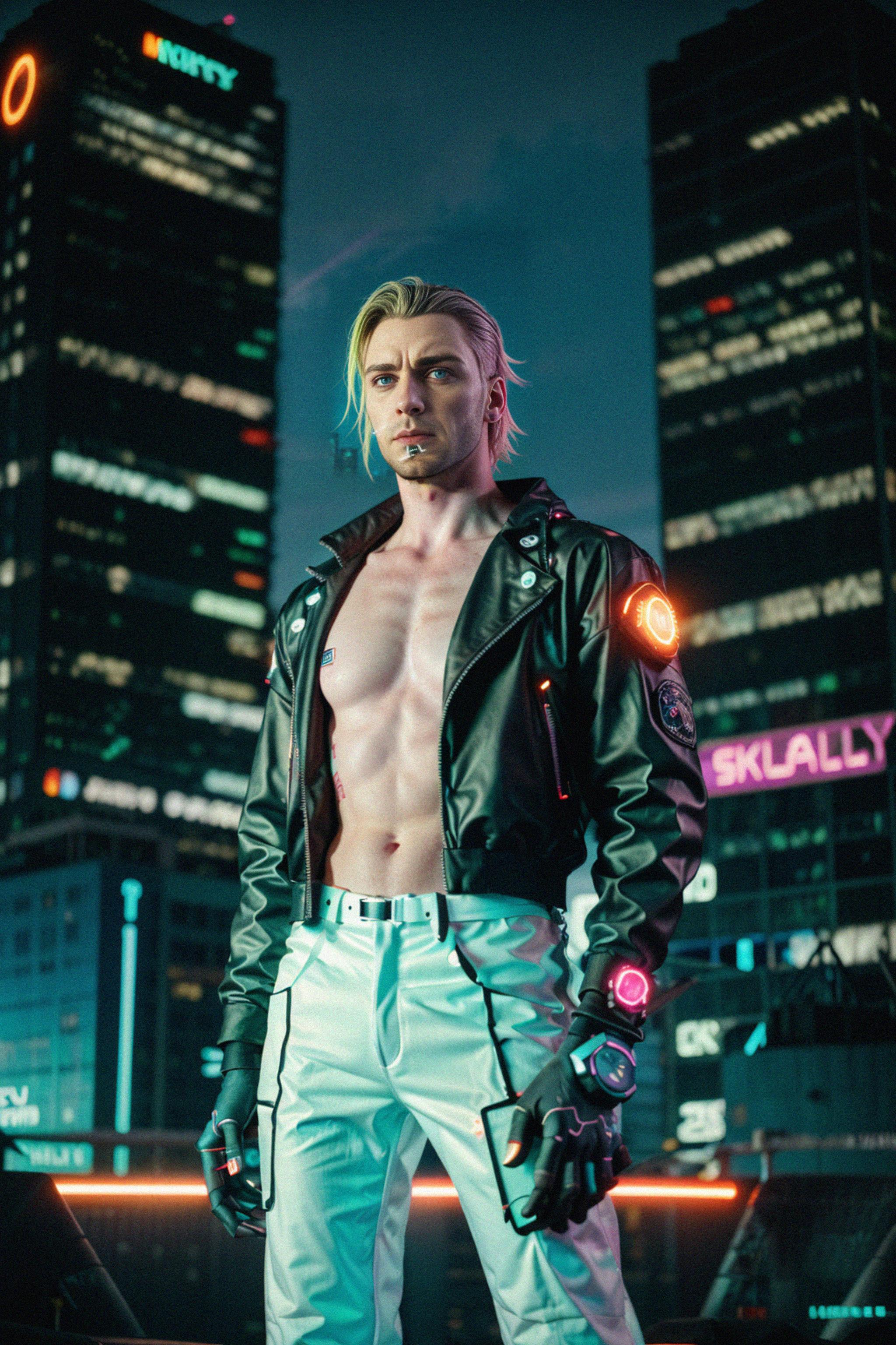 cyberpunk model with futuristic cyberpunk neon clothes standing in cyberpunk city with neon lights city on Mars in future, neon billboards, skyscrapers
