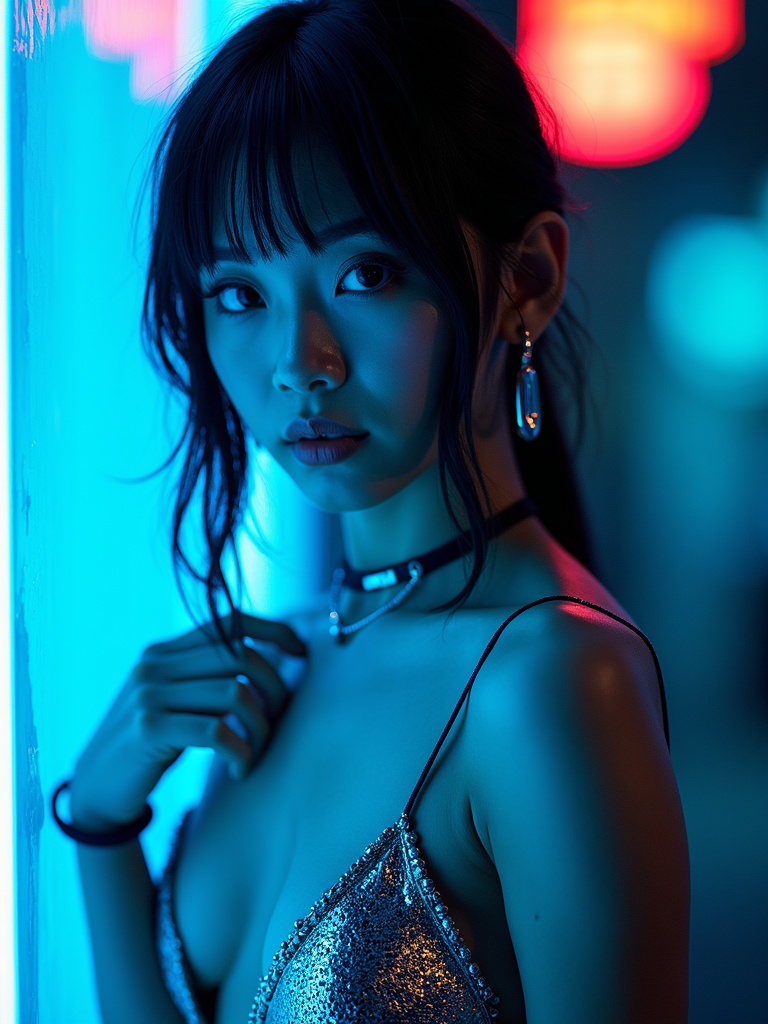 Cyberpunk Tokyo portrait. Blue neon lights reflecting off metallic dress, futuristic makeup . Blade Runner aesthetic.