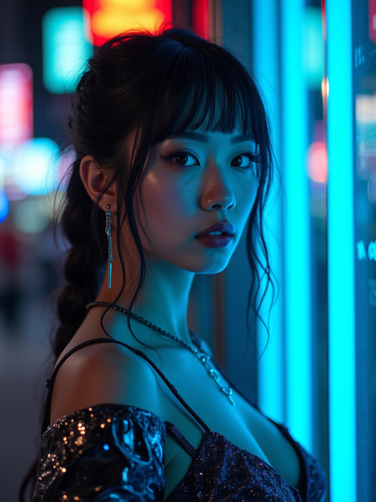 Cyberpunk Tokyo portrait. Blue neon lights reflecting off metallic dress, futuristic makeup . Blade Runner aesthetic.