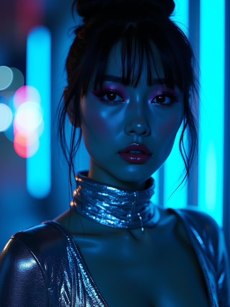Cyberpunk Tokyo portrait. Blue neon lights reflecting off metallic dress, futuristic makeup . Blade Runner aesthetic.