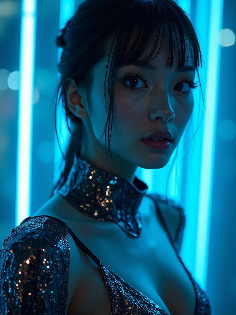 Cyberpunk Tokyo portrait. Blue neon lights reflecting off metallic dress, futuristic makeup . Blade Runner aesthetic.