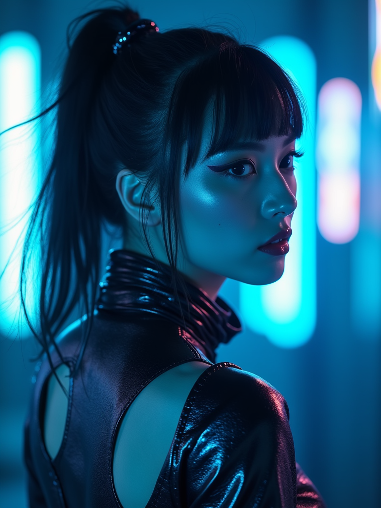 Cyberpunk Tokyo portrait. Blue neon lights reflecting off metallic dress, futuristic makeup . Blade Runner aesthetic.