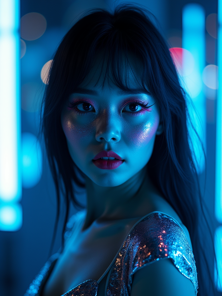 Cyberpunk Tokyo portrait. Blue neon lights reflecting off metallic dress, futuristic makeup . Blade Runner aesthetic.