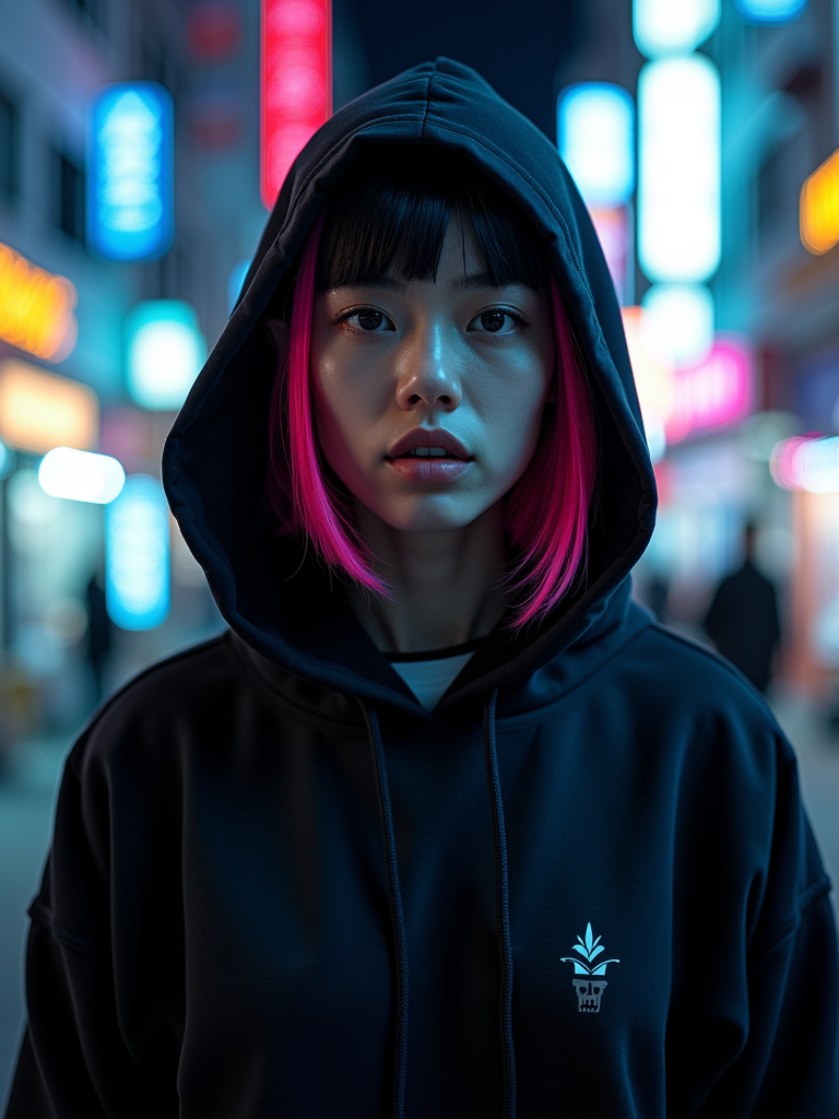 Cyberpunk Tokyo portrait. Dark hoodie, neon streaks in hair, futuristic techwear. Blade Runner aesthetic.