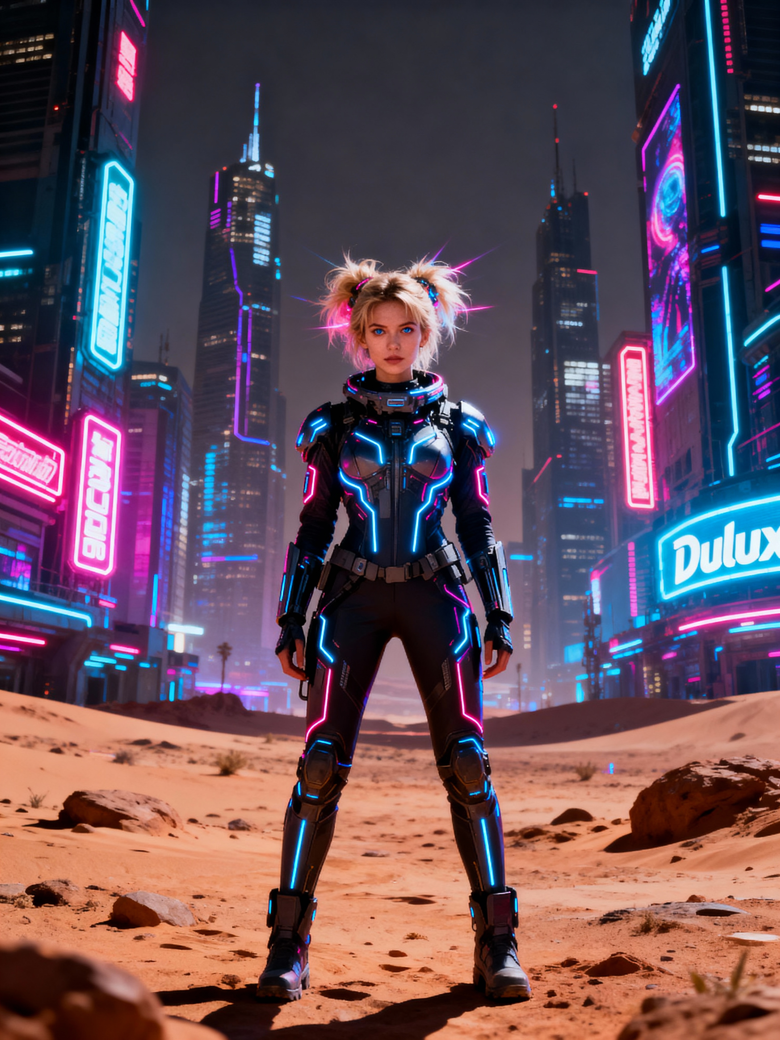 cyberpunk model with futuristic cyberpunk neon clothes standing in cyberpunk city with neon lights city on Mars in future, neon billboards, skyscrapers