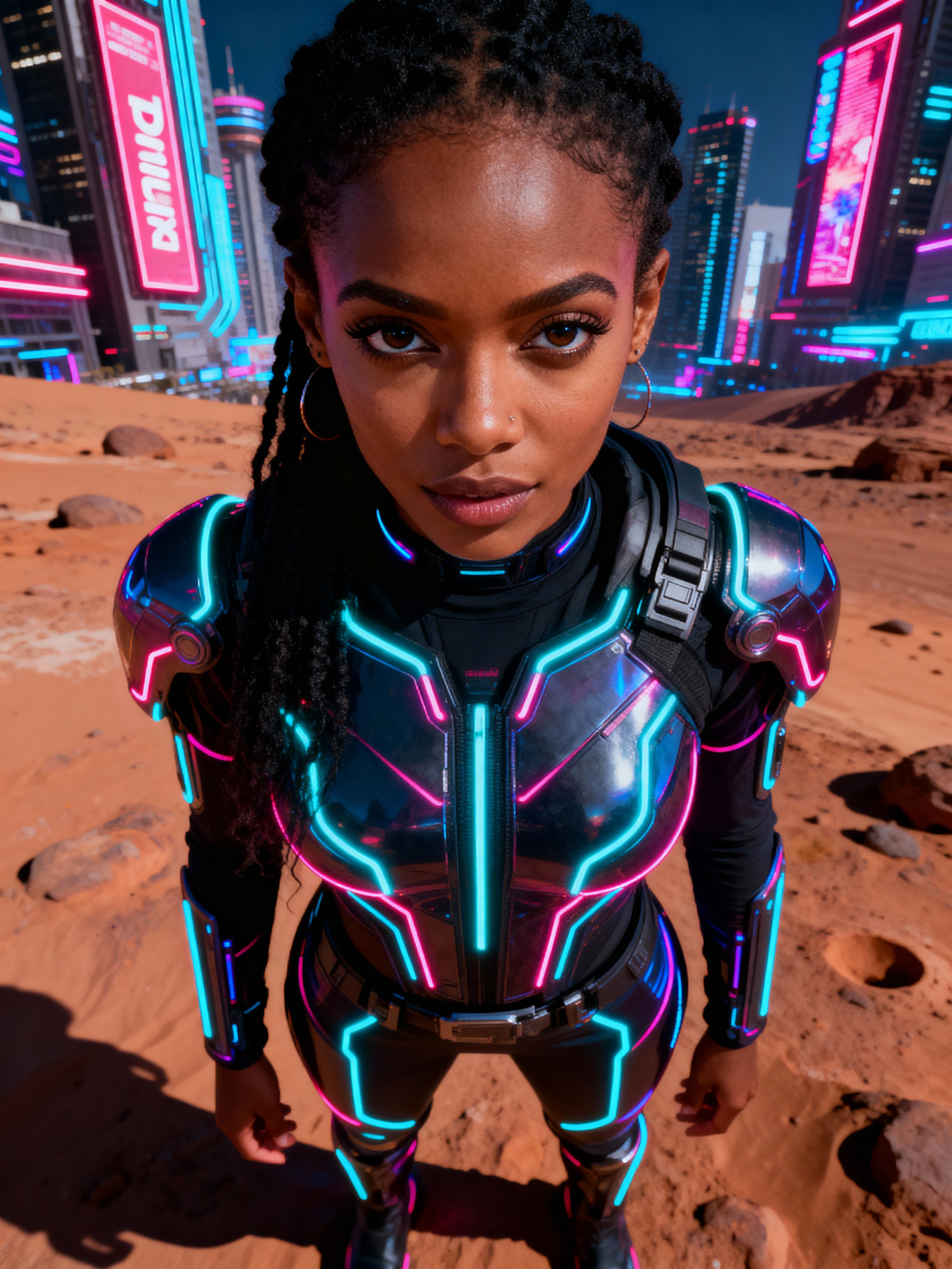 cyberpunk model with futuristic cyberpunk neon clothes standing in cyberpunk city with neon lights city on Mars in future, neon billboards, skyscrapers
