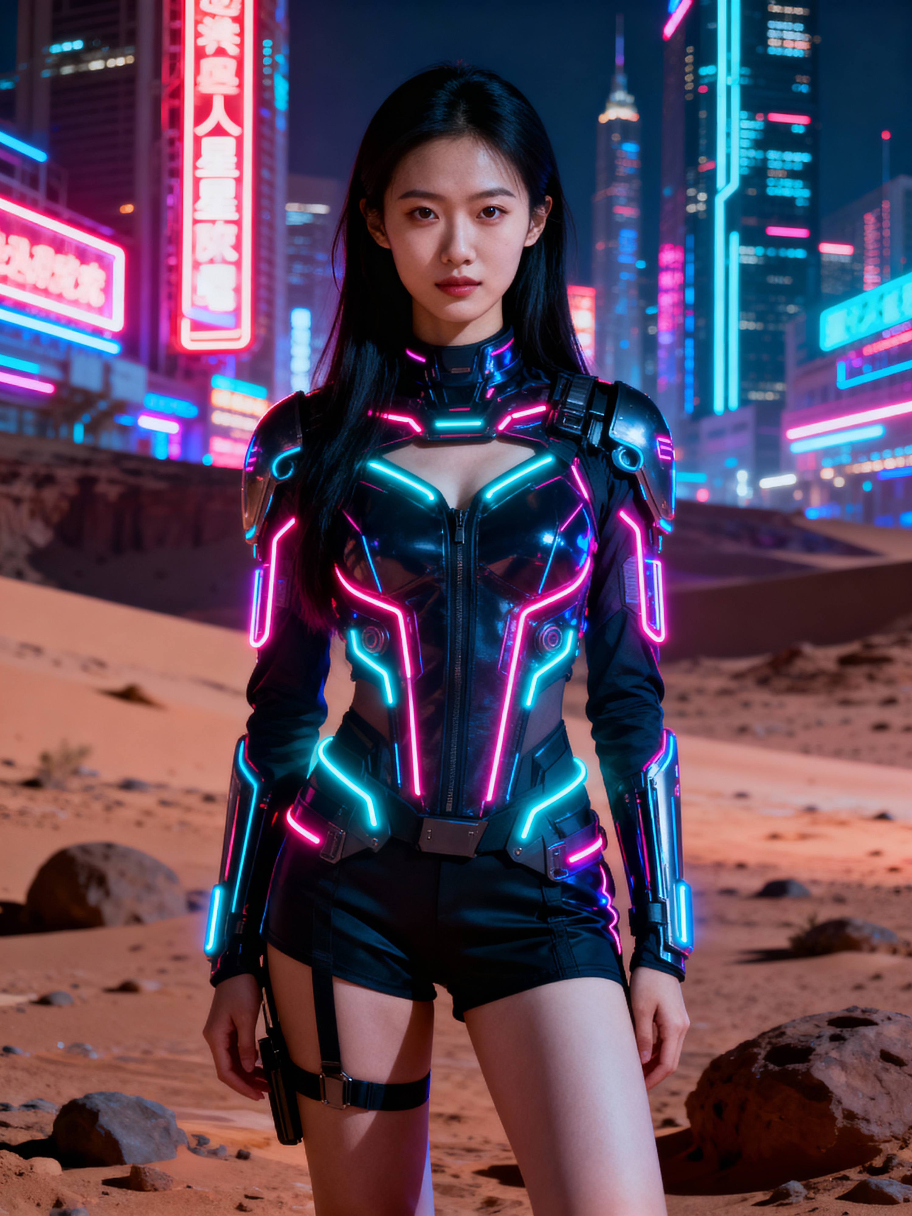 cyberpunk model with futuristic cyberpunk neon clothes standing in cyberpunk city with neon lights city on Mars in future, neon billboards, skyscrapers