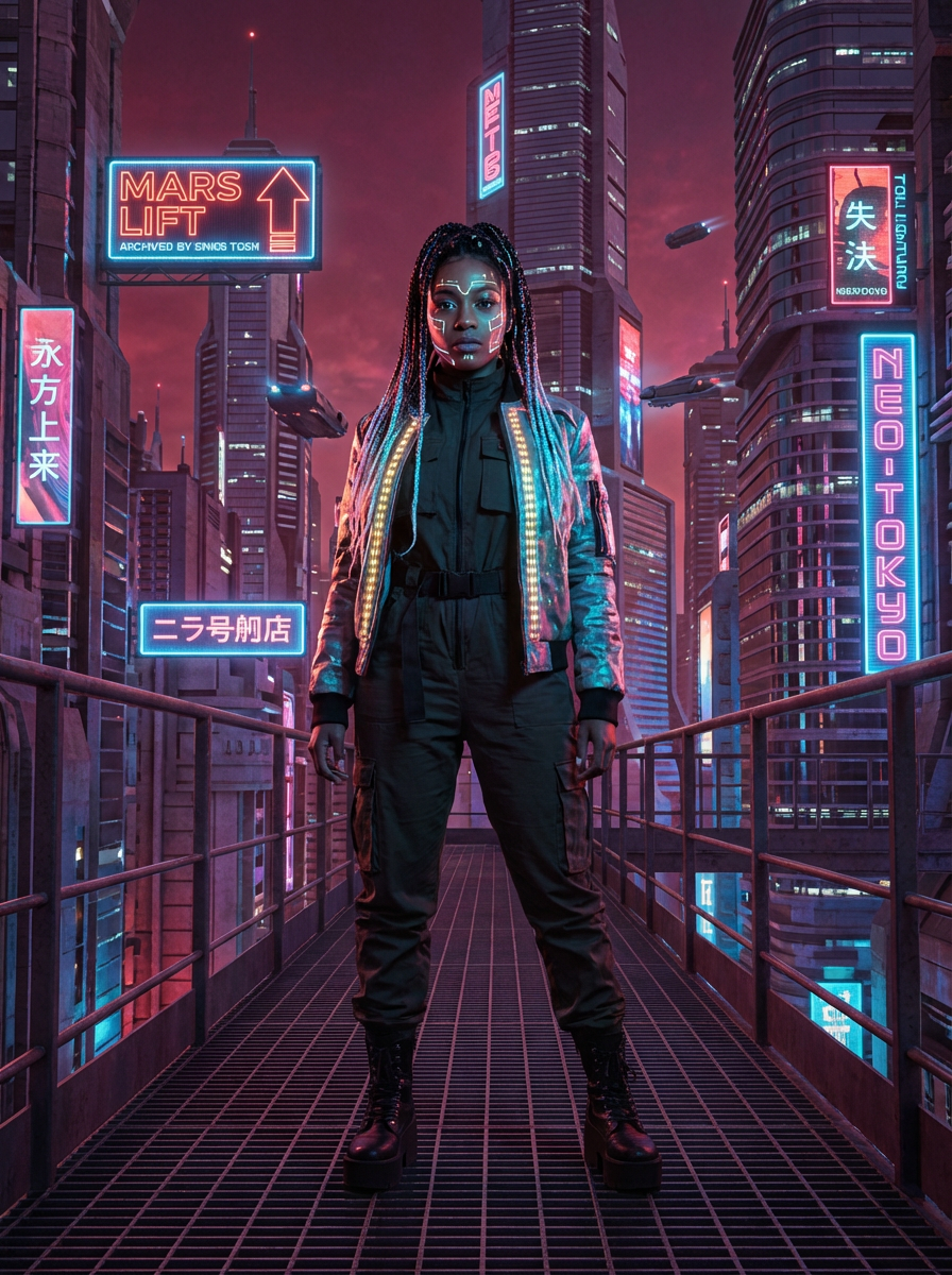 cyberpunk model with futuristic cyberpunk neon clothes standing in cyberpunk city with neon lights city on Mars in future, neon billboards, skyscrapers
