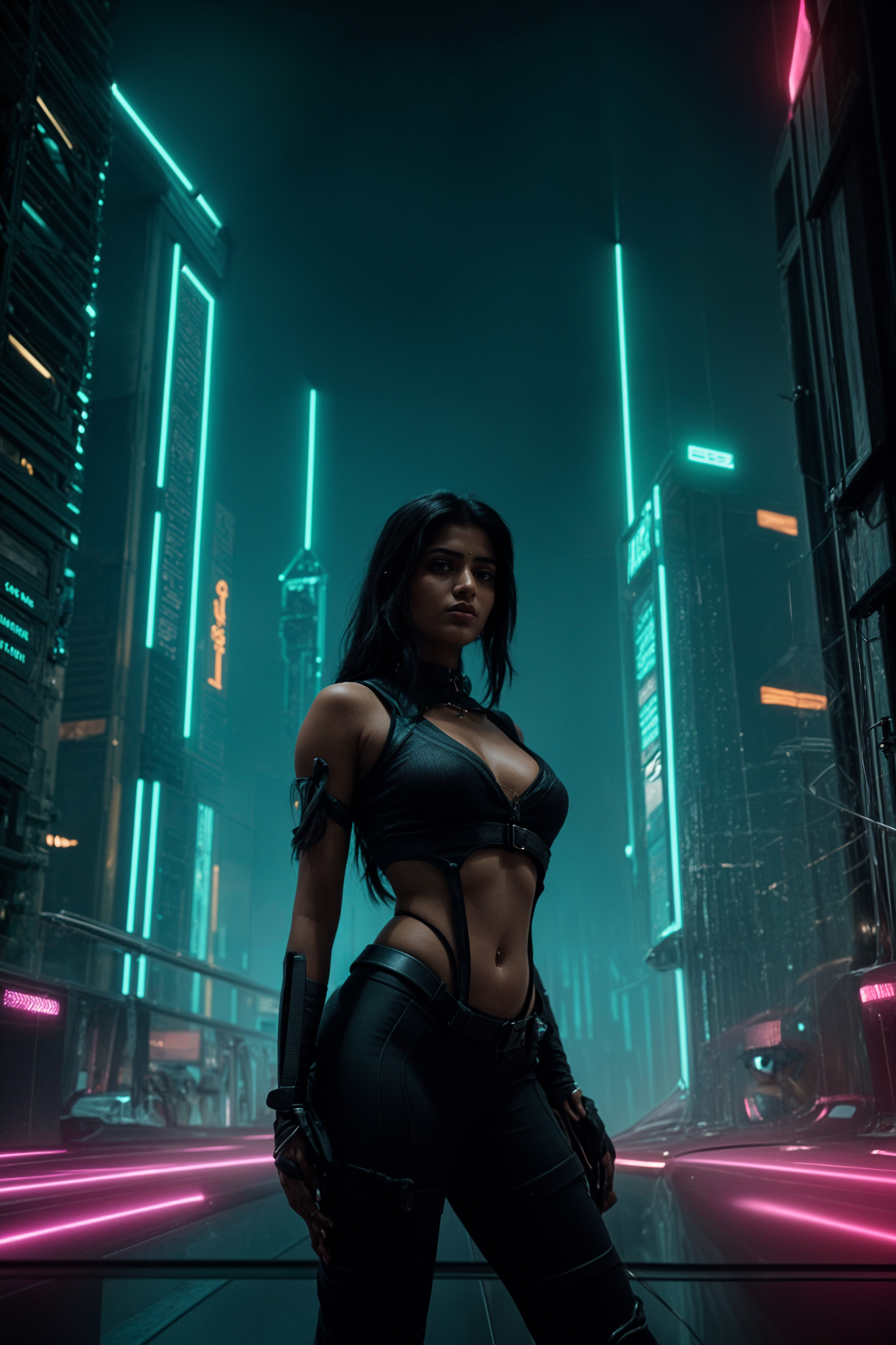 cyberpunk model with futuristic cyberpunk neon clothes standing in cyberpunk city with neon lights city on Mars in future, neon billboards, skyscrapers