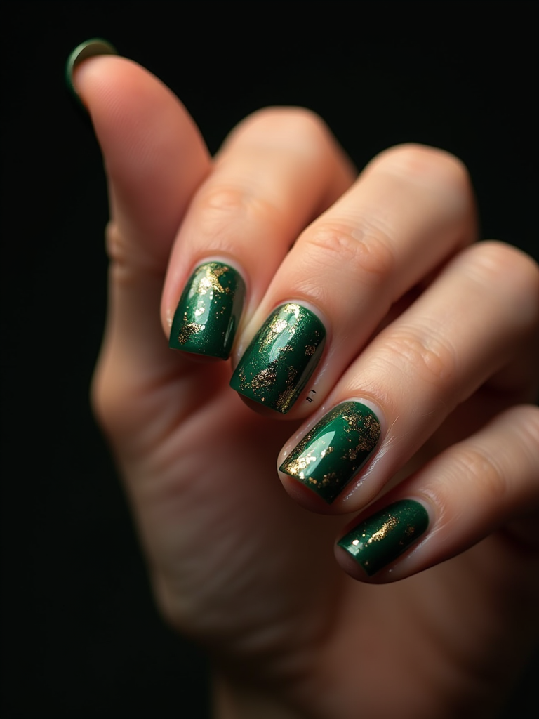 deep green nails with gold foil flakes, rich luxurious styling, elegant hand posture, dramatic lighting setup