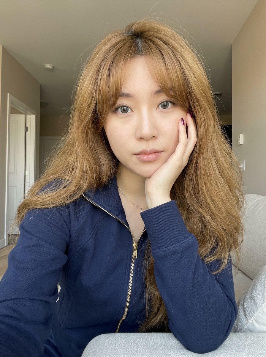 {"Description": "young model, early 20s, fair tone, long voluminous golden hair with layered cuts and curtain bangs.", "facial_features": {"eyes": "Large, expressive grey-blue eyes with winged eyeliner and defined lashes.", "lips": "Plump, naturally pink lips, slightly parted in a soft, relaxed expression.", "makeup": "Natural 'no-makeup' look with subtle rosy blush on cheeks and nose.", "hair_styling": "Messy chic, windswept look with strands falling over the forehead and eyes."}, "apparel": {"clothing": "Navy blue zip-up athletic jacket (track jacket) with a gold zipper partially zipped.", "jewelry": "Delicate gold chain necklace with a small pendant, thin gold rings on fingers.", "nails": "Manicured fingernails painted a dark berry/plum color."}, "exact_pose_anatomical": {"posture": "Seated, leaning forward slightly, resting weight on the left elbow (off-camera).", "head_orientation": "Tilted approximately 15 degrees to the subject's right (viewer's left).", "hand_placement": "Left hand rests against the left cheek and jawline, gently propping up the head. Fingers are relaxed and slightly curled, touching the face softly without distorting the skin.", "gaze": "Direct, engaging eye contact with the camera lens.", "expression": "Soft, dreamy, and slightly alluring."}, "camera_technical_values": {"focal_length": "30mm to 35mm (Standard wide portrait, creating a sense of intimacy and closeness).", "aperture": "f/2.8 (Subject's eyes and face are sharp, hair edges and background gently roll off into soft focus).", "shutter_speed": "1/100s.", "iso": "ISO 200 (Clean, noise-free indoor shot).", "perspective": "Eye-level or slightly above (selfie angle).", "framing": "Close-up portrait, cropping at the chest."}, "lighting_and_environment": {"setting": "Indoor domestic interior, likely a bedroom or living room.", "background_elements": "door with a silver handle on the left, neutral beige walls, recessed ceiling light (can light) visible at the top.", "lighting_source": "Large window (natural daylight) positioned in front of the subject.", "lighting_quality": "Soft, diffused beauty lighting. Even illumination on the face with minimal shadows, creating a 'glow' effect on the skin and highlighting the hair texture."}}