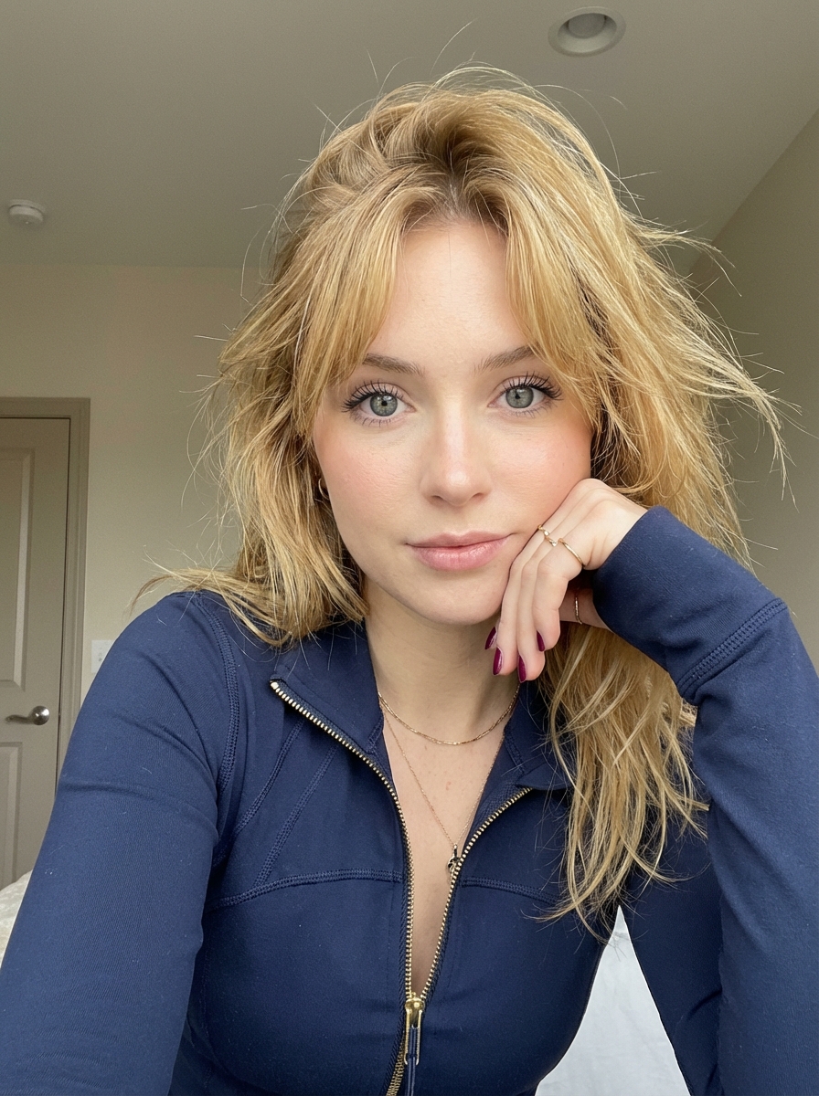 {"Description": "young model, early 20s, fair tone, long voluminous golden hair with layered cuts and curtain bangs.", "facial_features": {"eyes": "Large, expressive grey-blue eyes with winged eyeliner and defined lashes.", "lips": "Plump, naturally pink lips, slightly parted in a soft, relaxed expression.", "makeup": "Natural 'no-makeup' look with subtle rosy blush on cheeks and nose.", "hair_styling": "Messy chic, windswept look with strands falling over the forehead and eyes."}, "apparel": {"clothing": "Navy blue zip-up athletic jacket (track jacket) with a gold zipper partially zipped.", "jewelry": "Delicate gold chain necklace with a small pendant, thin gold rings on fingers.", "nails": "Manicured fingernails painted a dark berry/plum color."}, "exact_pose_anatomical": {"posture": "Seated, leaning forward slightly, resting weight on the left elbow (off-camera).", "head_orientation": "Tilted approximately 15 degrees to the subject's right (viewer's left).", "hand_placement": "Left hand rests against the left cheek and jawline, gently propping up the head. Fingers are relaxed and slightly curled, touching the face softly without distorting the skin.", "gaze": "Direct, engaging eye contact with the camera lens.", "expression": "Soft, dreamy, and slightly alluring."}, "camera_technical_values": {"focal_length": "30mm to 35mm (Standard wide portrait, creating a sense of intimacy and closeness).", "aperture": "f/2.8 (Subject's eyes and face are sharp, hair edges and background gently roll off into soft focus).", "shutter_speed": "1/100s.", "iso": "ISO 200 (Clean, noise-free indoor shot).", "perspective": "Eye-level or slightly above (selfie angle).", "framing": "Close-up portrait, cropping at the chest."}, "lighting_and_environment": {"setting": "Indoor domestic interior, likely a bedroom or living room.", "background_elements": "door with a silver handle on the left, neutral beige walls, recessed ceiling light (can light) visible at the top.", "lighting_source": "Large window (natural daylight) positioned in front of the subject.", "lighting_quality": "Soft, diffused beauty lighting. Even illumination on the face with minimal shadows, creating a 'glow' effect on the skin and highlighting the hair texture."}}