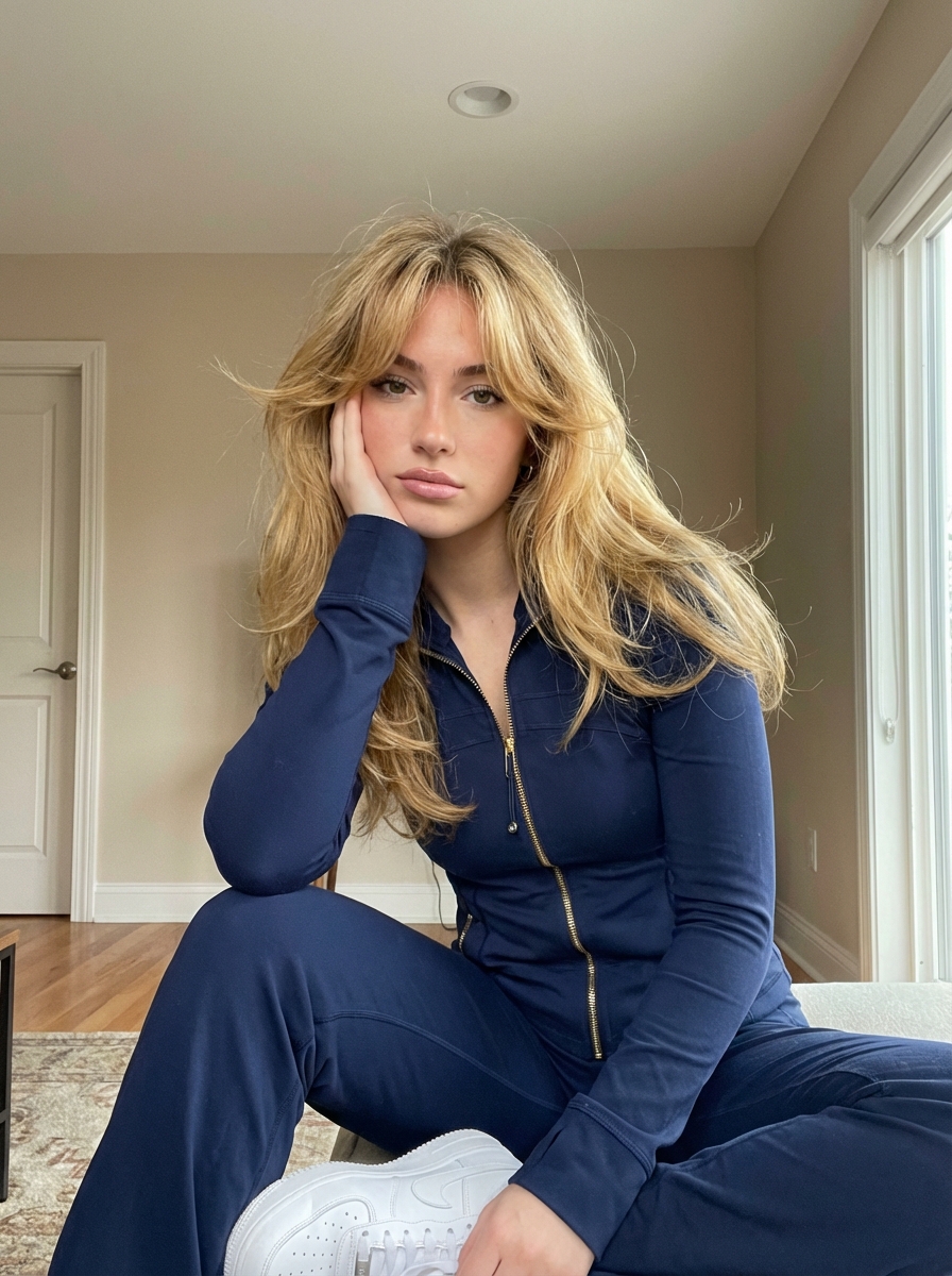 {"Description": "young model, early 20s, fair tone, long voluminous golden hair with layered cuts and curtain bangs.", "facial_features": {"eyes": "Large, expressive grey-blue eyes with winged eyeliner and defined lashes.", "lips": "Plump, naturally pink lips, slightly parted in a soft, relaxed expression.", "makeup": "Natural 'no-makeup' look with subtle rosy blush on cheeks and nose.", "hair_styling": "Messy chic, windswept look with strands falling over the forehead and eyes."}, "apparel": {"clothing": "Navy blue zip-up athletic jacket (track jacket) with a gold zipper partially zipped.", "jewelry": "Delicate gold chain necklace with a small pendant, thin gold rings on fingers.", "nails": "Manicured fingernails painted a dark berry/plum color."}, "exact_pose_anatomical": {"posture": "Seated, leaning forward slightly, resting weight on the left elbow (off-camera).", "head_orientation": "Tilted approximately 15 degrees to the subject's right (viewer's left).", "hand_placement": "Left hand rests against the left cheek and jawline, gently propping up the head. Fingers are relaxed and slightly curled, touching the face softly without distorting the skin.", "gaze": "Direct, engaging eye contact with the camera lens.", "expression": "Soft, dreamy, and slightly alluring."}, "camera_technical_values": {"focal_length": "30mm to 35mm (Standard wide portrait, creating a sense of intimacy and closeness).", "aperture": "f/2.8 (Subject's eyes and face are sharp, hair edges and background gently roll off into soft focus).", "shutter_speed": "1/100s.", "iso": "ISO 200 (Clean, noise-free indoor shot).", "perspective": "Eye-level or slightly above (selfie angle).", "framing": "Close-up portrait, cropping at the chest."}, "lighting_and_environment": {"setting": "Indoor domestic interior, likely a bedroom or living room.", "background_elements": "door with a silver handle on the left, neutral beige walls, recessed ceiling light (can light) visible at the top.", "lighting_source": "Large window (natural daylight) positioned in front of the subject.", "lighting_quality": "Soft, diffused beauty lighting. Even illumination on the face with minimal shadows, creating a 'glow' effect on the skin and highlighting the hair texture."}}
