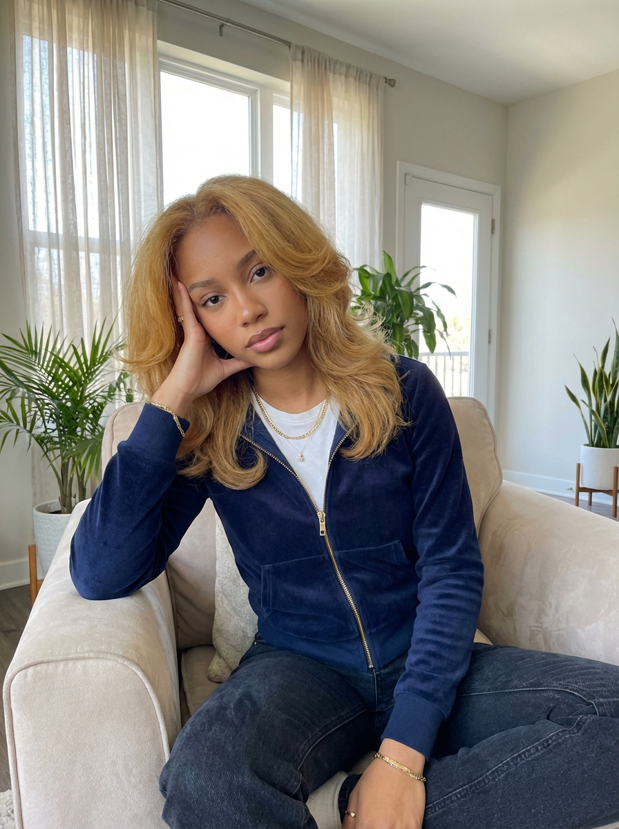 {"Description": "young model, early 20s, fair tone, long voluminous golden hair with layered cuts and curtain bangs.", "facial_features": {"eyes": "Large, expressive grey-blue eyes with winged eyeliner and defined lashes.", "lips": "Plump, naturally pink lips, slightly parted in a soft, relaxed expression.", "makeup": "Natural 'no-makeup' look with subtle rosy blush on cheeks and nose.", "hair_styling": "Messy chic, windswept look with strands falling over the forehead and eyes."}, "apparel": {"clothing": "Navy blue zip-up athletic jacket (track jacket) with a gold zipper partially zipped.", "jewelry": "Delicate gold chain necklace with a small pendant, thin gold rings on fingers.", "nails": "Manicured fingernails painted a dark berry/plum color."}, "exact_pose_anatomical": {"posture": "Seated, leaning forward slightly, resting weight on the left elbow (off-camera).", "head_orientation": "Tilted approximately 15 degrees to the subject's right (viewer's left).", "hand_placement": "Left hand rests against the left cheek and jawline, gently propping up the head. Fingers are relaxed and slightly curled, touching the face softly without distorting the skin.", "gaze": "Direct, engaging eye contact with the camera lens.", "expression": "Soft, dreamy, and slightly alluring."}, "camera_technical_values": {"focal_length": "30mm to 35mm (Standard wide portrait, creating a sense of intimacy and closeness).", "aperture": "f/2.8 (Subject's eyes and face are sharp, hair edges and background gently roll off into soft focus).", "shutter_speed": "1/100s.", "iso": "ISO 200 (Clean, noise-free indoor shot).", "perspective": "Eye-level or slightly above (selfie angle).", "framing": "Close-up portrait, cropping at the chest."}, "lighting_and_environment": {"setting": "Indoor domestic interior, likely a bedroom or living room.", "background_elements": "door with a silver handle on the left, neutral beige walls, recessed ceiling light (can light) visible at the top.", "lighting_source": "Large window (natural daylight) positioned in front of the subject.", "lighting_quality": "Soft, diffused beauty lighting. Even illumination on the face with minimal shadows, creating a 'glow' effect on the skin and highlighting the hair texture."}}