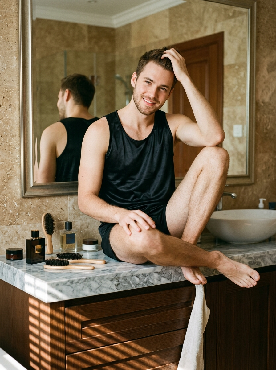 {"description":"Create a hyper-realistic medium shot of a young male model sitting casually on a marble bathroom vanity countertop in a refined luxury interior. The image must follow real photographic logic, anatomy, and natural lighting behavior, with no CGI or artificial look.","subject_and_pose":{"pose":"the model sits naturally on the edge of the vanity, relaxed and confident","posture":"Realistic posture with natural weight distribution","legs":"Crossed casually at the ankles or resting in a relaxed position","hands":"One hand gently runs through his hair, the other rests naturally on his ","expression":"Warm, natural smile","gaze":"Looking directly into the camera for a candid, connection"},"outfit_and_styling":{"clothing":"Fitted satin tank top with a softly gathered chest","fabric_behavior":[" natural sheen from light","Realistic folds and tension","Accurate drape and gravity"],"accessories":"Simple chain necklace","makeup":"Minimal grooming with natural skin texture, light stubble, subtle sheen, and clean groomed features"},"environment":{"setting":"Luxury bathroom interior","walls":"Beige, speckled stone or ceramic tile","vanity":"and grey marble countertop with dark wood cabinetry beneath","mirror":"Large rectangular mirror with a wooden frame positioned directly behind the subject, reflecting his back and a wooden door for depth"},"foreground_props":{"countertop_items":["Dark luxury cologne bottle with metallic accents","Grooming brushes","Open aftershave","Small skincare jars"],"sink":"vessel sink positioned to his right","placement":"All objects are realistically scaled, naturally placed, and softly integrated into the scene"},"lighting_and_atmosphere":{"light":"Warm, cinematic side lighting from the right, mimicking golden-hour sunlight","shadow_behavior":"Distinct striped shadows (venetian blind or gobo effect) across his legs and lower cabinetry","light_quality":["Soft highlights","Gentle falloff","Realistic contrast"],"mood":" , cozy, sun-drenched"},"camera_and_photography":{"style":"Lifestyle and fashion editorial photography","angle":"Eye-level to slightly low angle","lens_look":"50\u201385mm portrait lens","depth_of_field":"Shallow depth of field with soft background separation","film_aesthetic":{"grain":"Subtle 35mm film grain","color_grading":"Kodak Portra 400\u2013style with warm skin tones, gentle contrast, and organic texture"},"lighting_source":"Natural light only, no flash"},"overall_mood":" luxury, candid elegance, modern masculinity, captured as a private cinematic moment with analog film realism"}