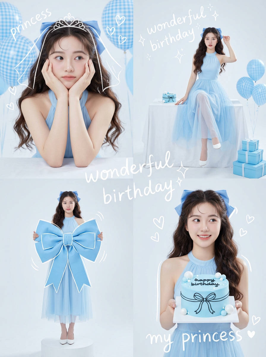 {"Description":"Korean Idol Studio Portrait style, soft high-key lighting, pastel blue color palette, mixed media with white hand-drawn doodle overlays.","subject_details":{"demographics":"Young Asian model, 18 years old, fresh and elegant visual.","styling":{"hair":"Long, dark brown, voluminous loose waves. Styled half-up or with a large blue ribbon accessory.","outfit":"Elegant blue sleeveless halter-neck dress with a flowing chiffon or tulle skirt.","makeup":"Fresh dewy skin, peach\/pink blush, glossy lips, defined eyelashes (Idol makeup style)."}},"panel_breakdown":{"top_left_panel":{"framing":"Close-up Portrait.","pose":"Leaning elbows on a white surface, face resting in palms ('flower pose'), squishing cheeks slightly. Looking off-camera with a cute, dreamy expression.","doodles":"White scribble of a veil\/tiara on head, text 'Princess', floating hearts.","props":"Blue gingham patterned balloons in background."},"top_right_panel":{"framing":"Full Body \/ Wide Shot.","pose":"Sitting elegantly sideways on a table covered in a white cloth. One hand touching the ribbon in hair, legs crossed at ankles. Looking at camera.","props":"Small blue cake on table, blue gift boxes stacked on floor, blue gingham balloons.","doodles":"Text 'Wonderful Birthday' and sparkle drawings."},"bottom_left_panel":{"framing":"Full Body standing.","pose":"Standing straight, holding a massive, oversized blue bow prop (fashion editorial style) against her chest.","doodles":"White outlines tracing the bow to emphasize the shape, motion lines.","props":"Standing on a small white circular pedestal."},"bottom_right_panel":{"framing":"Waist-up Shot.","pose":"Holding a minimalist blue birthday cake with both hands at chest level. Head tilted, looking away to the side with a bright smile.","cake_details":"Blue icing, white ball decorations, text 'HAPPY BIRTHDAY' in black.","doodles":"White ribbon drawn on the cake, heart shapes, text 'My Princess '."}},"camera_technical_values":{"lens":"85mm (Portrait telephoto for flattering facial features).","aperture":"f\/2.8 to f\/4.0 (Soft background blur).","shutter_speed":"1\/200s.","iso":"ISO 100.","lighting_setup":"High-Key Studio Lighting. Bright, soft, shadowless 'beauty' light. White seamless background.","tone":"Cool pastel blue tones, bright and airy."},"post_processing":{"overlays":"Handwritten white crayon\/chalk text reading 'Wonderful Birthday', 'Princess My'. Cute doodle illustrations of stars, hearts, and ribbons."}}