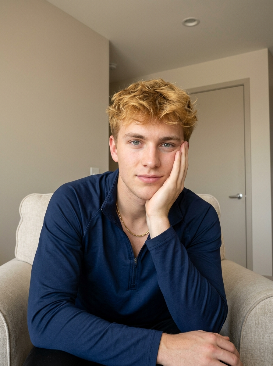 {"Description":"young male model, early 20s, fair skin, short tousled golden hair with textured layers and fringe.","facial_features":{"eyes":"Large, expressive grey-blue eyes.","lips":"Full, naturally pink lips, slightly parted in a relaxed expression.","makeup":"Clean-shaven with light stubble, natural features on cheeks and nose.","hair_styling":"Messy chic, windswept look with strands falling over the forehead and eyes."},"apparel":{"clothing":"Navy blue zip-up athletic jacket (track jacket) with a gold zipper partially zipped.","jewelry":"Simple gold chain necklace with a small pendant.","nails":"Short, groomed fingernails, natural color."},"exact_pose_anatomical":{"posture":"Seated, leaning forward slightly, resting weight on the left elbow (off-camera).","head_orientation":"Tilted approximately 15 degrees to the subject's right (viewer's left).","hand_placement":"Left hand rests against the left cheek and jawline, casually propping up the head. Fingers are relaxed and slightly curled, touching the face softly distorting the skin.","gaze":"Direct, engaging eye contact with the camera lens.","expression":"Relaxed, confident, and subtly intense."},"camera_technical_values":{"focal_length":"30mm to 35mm (Standard wide portrait, creating a sense of intimacy and closeness).","aperture":"f\/2.8 (Subject's eyes and face are sharp, hair edges and background gently roll off into soft focus).","shutter_speed":"1\/100s.","iso":"ISO 200 (Clean, noise-free indoor shot).","perspective":"Eye-level or slightly above (selfie angle).","framing":"Close-up portrait, cropping at the chest."},"lighting_and_environment":{"setting":"Indoor domestic interior, likely a bedroom or living room.","background_elements":"door with a silver handle on the left, neutral beige walls, recessed ceiling light (can light) at the top.","lighting_source":"Large window (natural daylight) positioned in front of the subject.","lighting_quality":"Soft, diffused beauty lighting. Even illumination on the face with minimal shadows, creating a 'glow' effect on the skin and highlighting the hair texture."}}