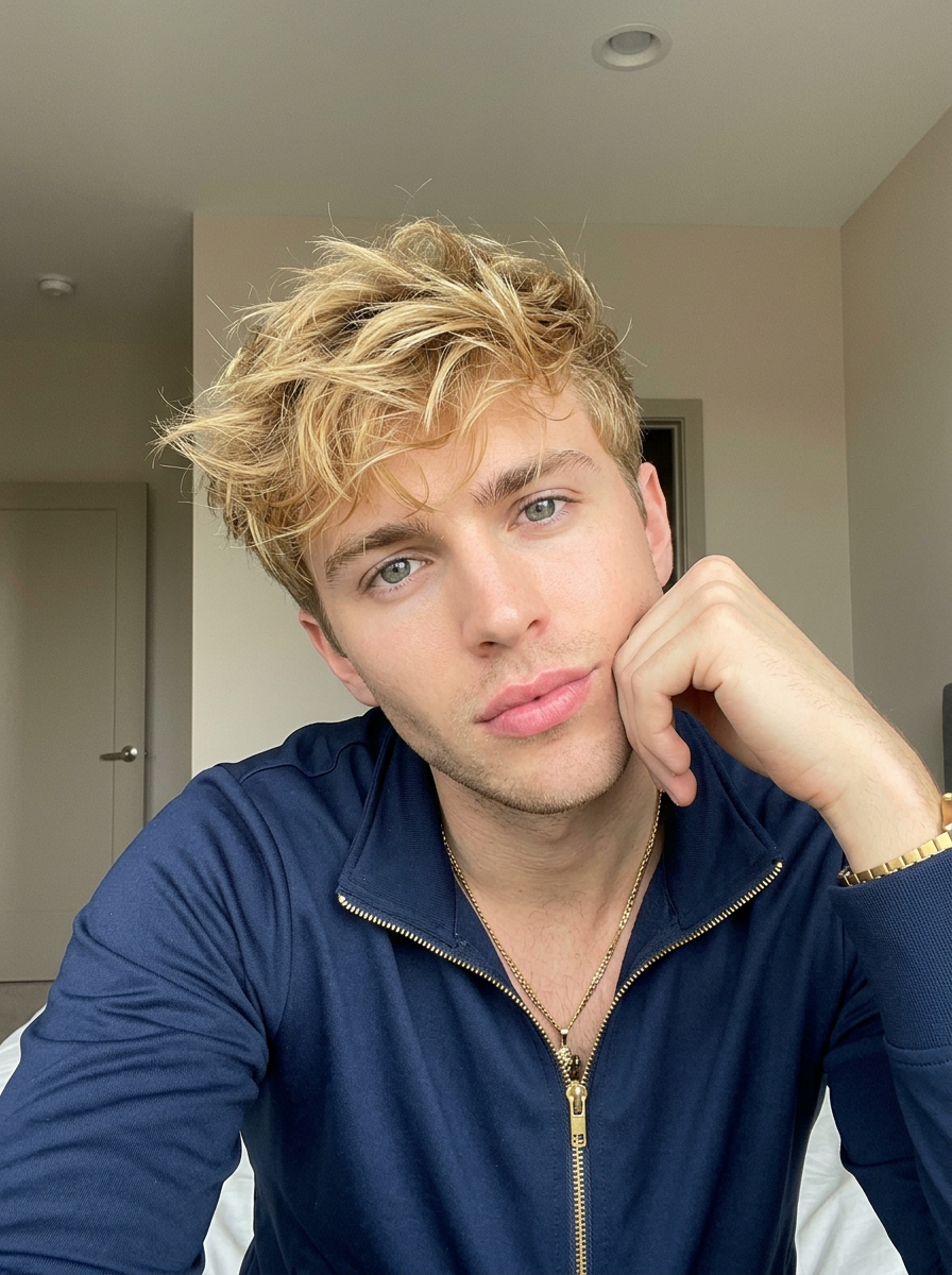 {"Description":"young male model, early 20s, fair skin, short voluminous golden blonde hair with textured layers and tousled fringe.","facial_features":{"eyes":"Large, expressive grey-blue eyes.","lips":"Full, naturally pink lips, slightly parted in a relaxed expression.","makeup":"Natural clean-shaven look with light stubble and natural features on cheeks and nose.","hair_styling":"Messy chic, windswept look with strands falling over the forehead."},"apparel":{"clothing":"Navy blue zip-up athletic jacket (track jacket) with a gold zipper partially zipped.","jewelry":"Masculine gold chain necklace with a small pendant, simple gold watch on wrist.","nails":"Short, groomed fingernails."},"exact_pose_anatomical":{"posture":"Seated, leaning forward slightly, resting weight on the left elbow (off-camera).","head_orientation":"Tilted approximately 15 degrees to the subject's right (viewer's left).","hand_placement":"Left hand rests against the left cheek and jawline, gently propping up the head. Fingers are relaxed and slightly curled, touching the face softly distorting the skin.","gaze":"Direct, engaging eye contact with the camera lens.","expression":"Relaxed, confident, and intense."},"camera_technical_values":{"focal_length":"30mm to 35mm (Standard wide portrait, creating a sense of intimacy and closeness).","aperture":"f\/2.8 (Subject's eyes and face are sharp, hair edges and background gently roll off into soft focus).","shutter_speed":"1\/100s.","iso":"ISO 200 (Clean, noise-free indoor shot).","perspective":"Eye-level or slightly above (selfie angle).","framing":"Close-up portrait, cropping at the chest."},"lighting_and_environment":{"setting":"Indoor domestic interior, likely a bedroom or living room.","background_elements":"door with a silver handle on the left, neutral beige walls, recessed ceiling light (can light) at the top.","lighting_source":"Large window (natural daylight) positioned in front of the subject.","lighting_quality":"Soft, diffused beauty lighting. Even illumination on the face with minimal shadows, creating a 'glow' effect on the skin and highlighting the hair texture."}}