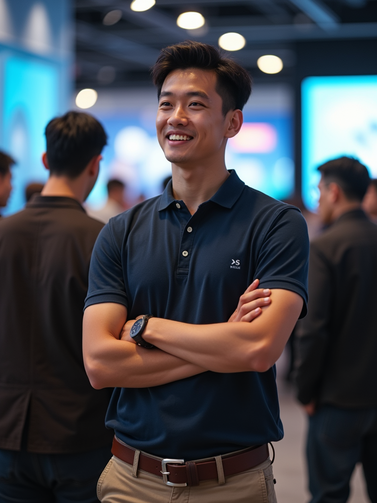 determined model wearing tech-casual polo and chinos networking at a tech conference, professional casual attire, engaged in conversation