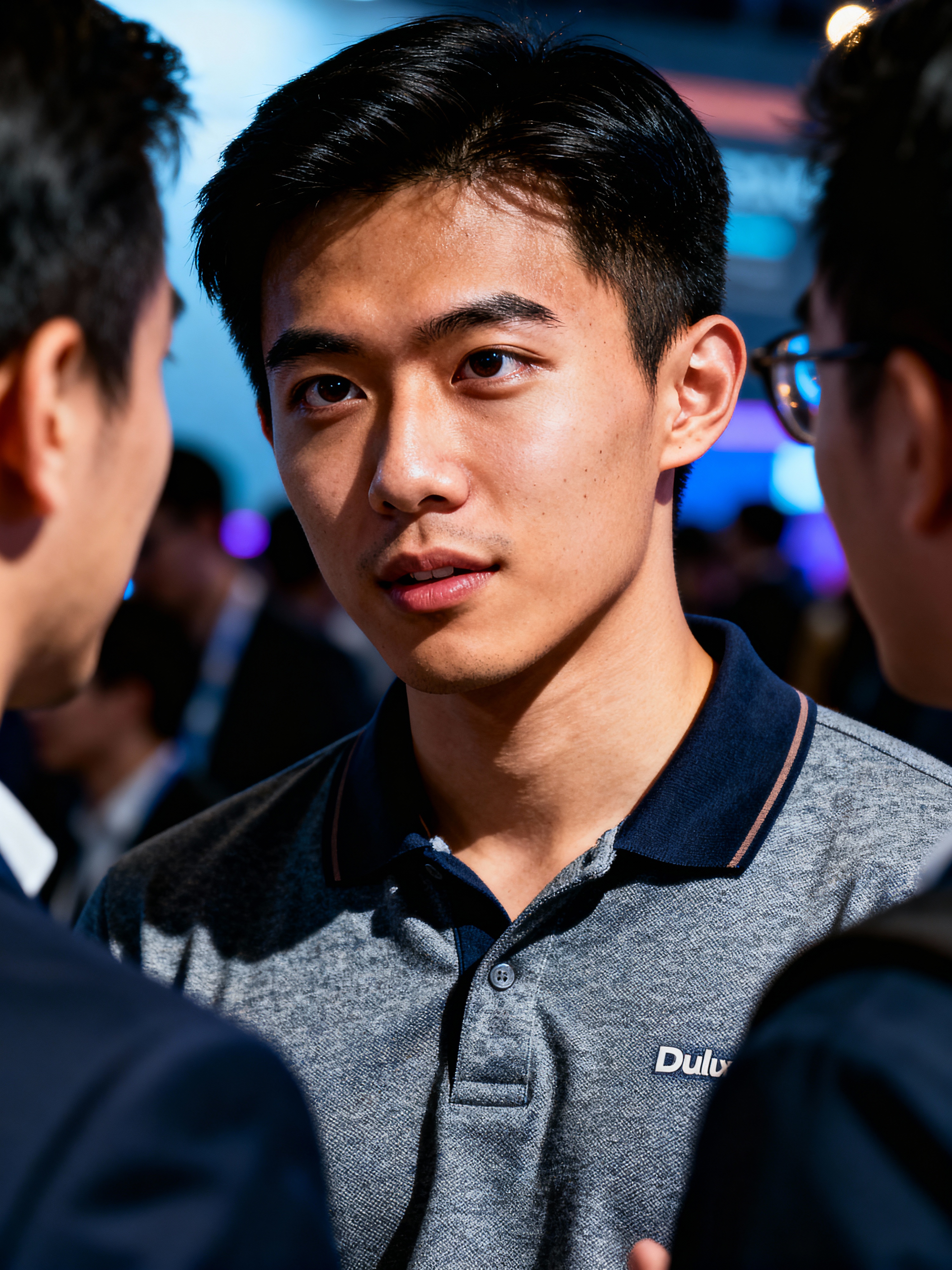 determined model wearing tech-casual polo and chinos networking at a tech conference, professional casual attire, engaged in conversation